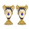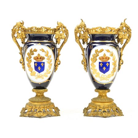 Coppia di vasi Napoleone III in porcellana di Sevres dipinta a mano e decori in oro raffiguranti da un lato Luigi XVI e Maria Antonietta e dall'altro stemmi reali, montatura in bronzo dorato.