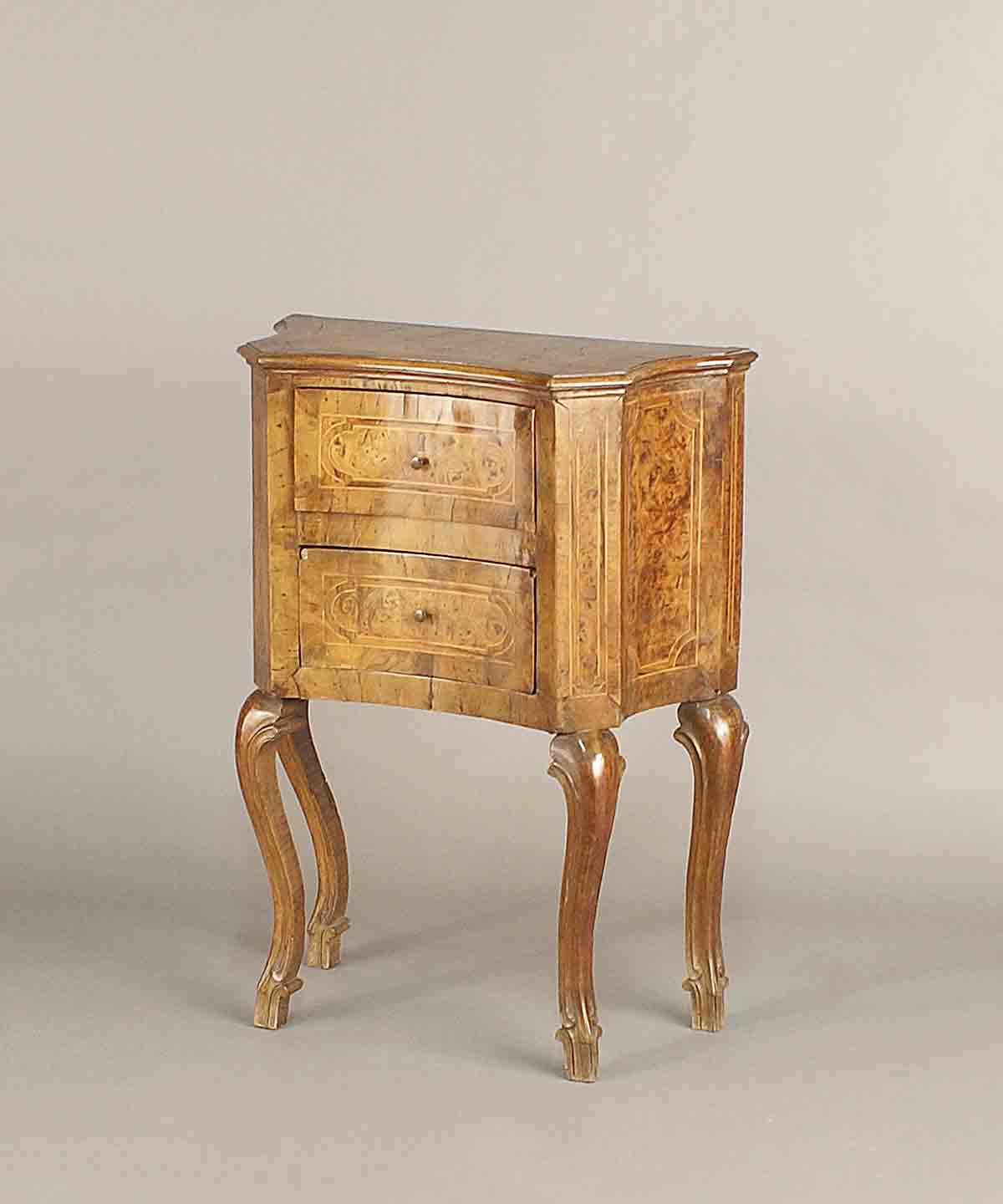Piccola commode in noce e radica filettata in legno di bosso, piano sagomato con due cassetti sottostanti poggianti su gambe di linea arcuata, Italia centrale, fine del XVIII secolo, cm. 84x63x34 (difetti).