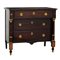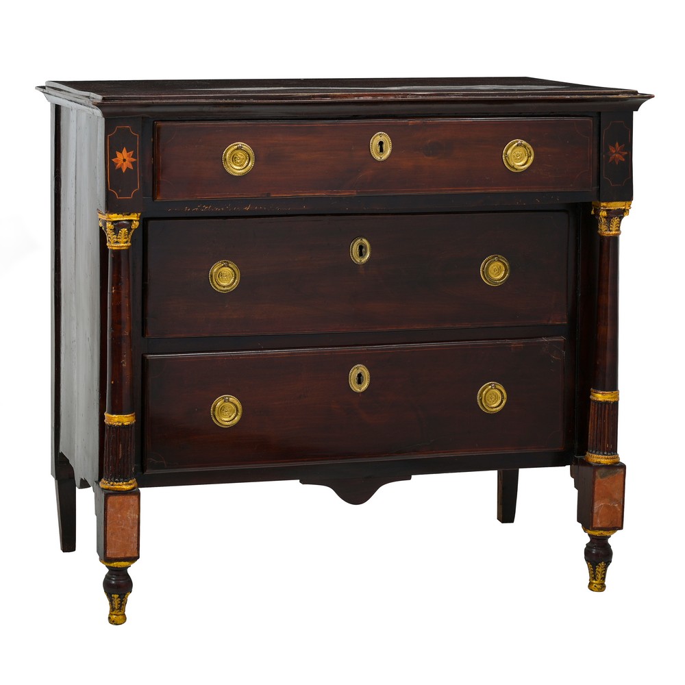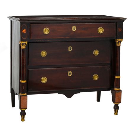 Cassettone Impero a tre cassetti in mogano ed intarsi in bosso. Maniglie in ottone dorato. Nella parte terminale del piede intarsi in marmo rosso (usure).