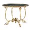 Tavolo tondo in ferro battuto dorato con piano in legno laccato e decorato a motivo floreale e fogliaceo.