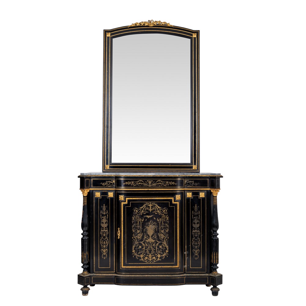 Credenza Napoleone III ad un'anta con specchiera in legno ebanizzato, tarsie in rame e guarniture in bronzo; piano in marmo grigio.
