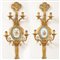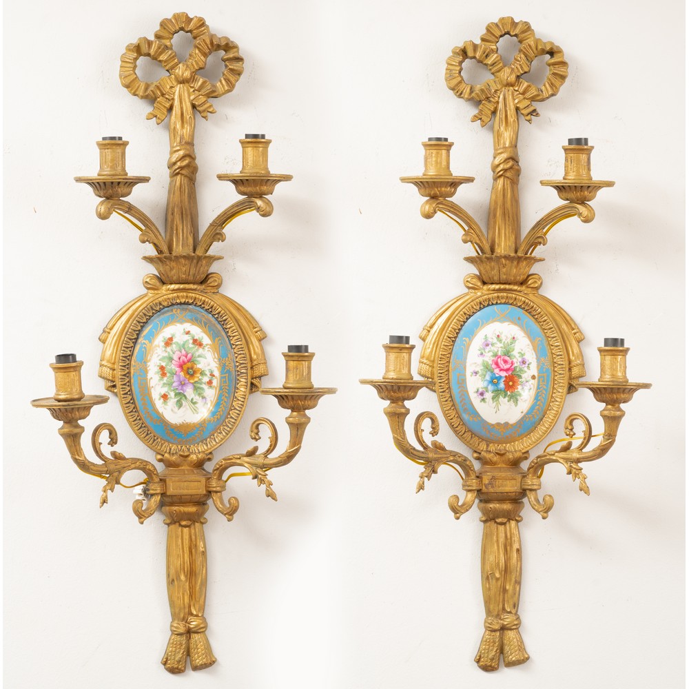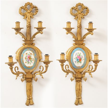 Coppia di applique in bronzo dorato a due luci con placche in porcellana di Sevres.