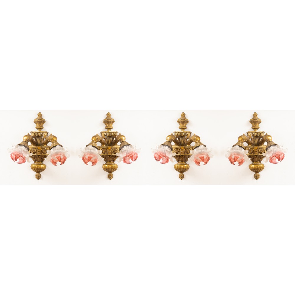 QUATTRO APPLIQUE in bronzo dorato a due luci con bocce in vetro.