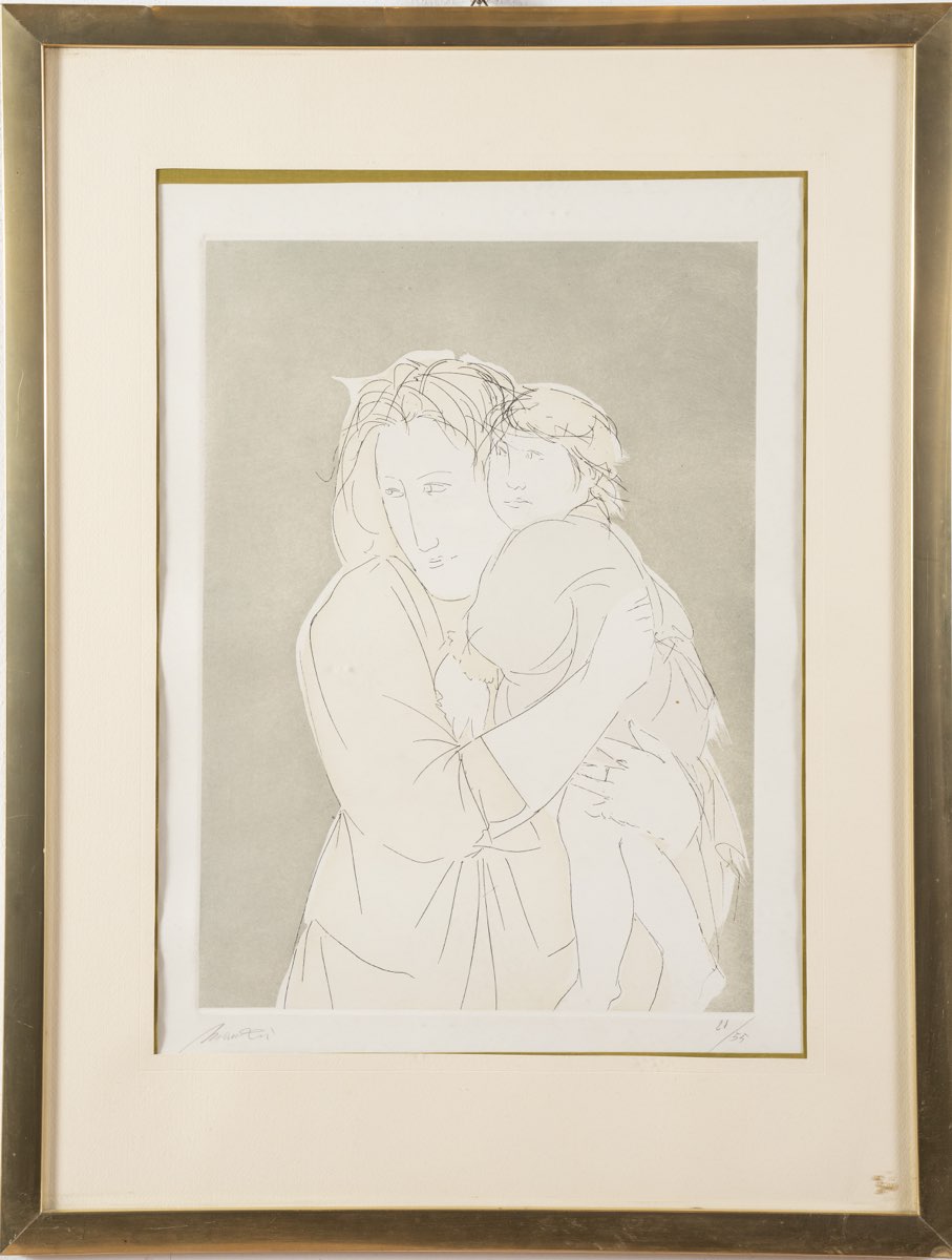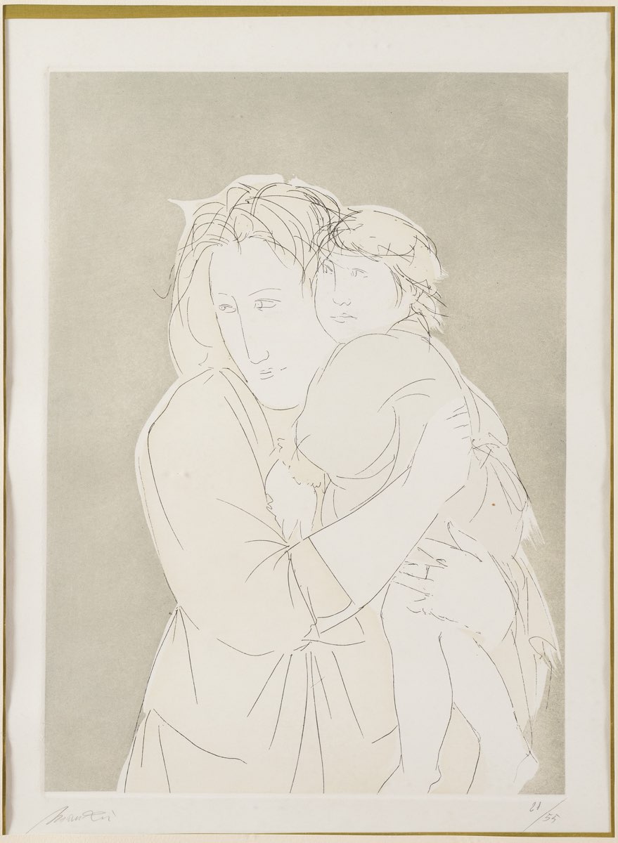 Giacomo Manzù (Bergamo 1908 - Roma 1991), “Maternità”. Litografia a colori su carta, firmata in basso a sinistra, numero di tiratura in basso a destra 21/55, Lastra H cm 47x34
