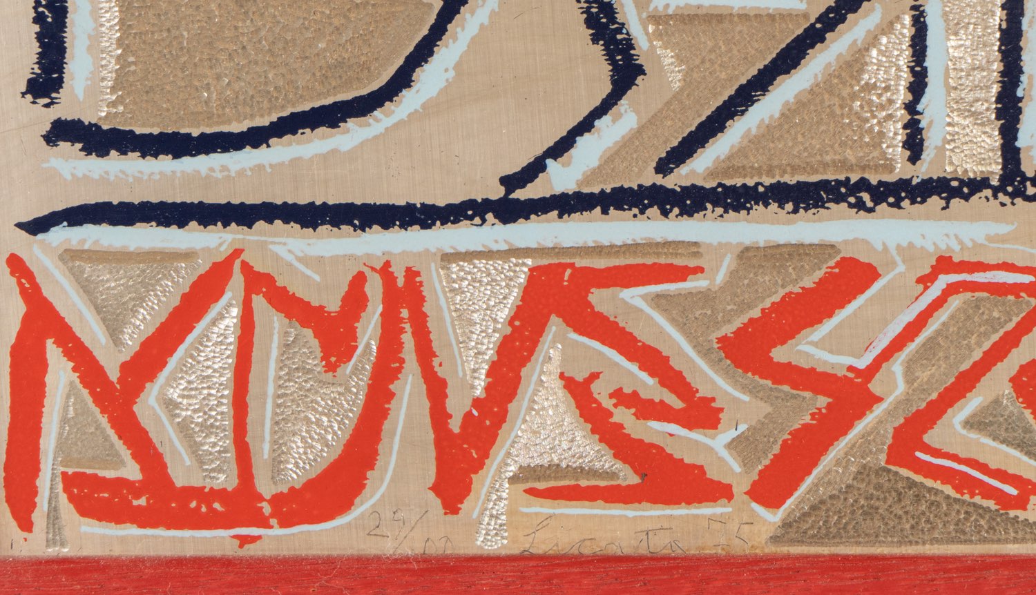 Riccardo Licata (Torino 1929 - Venezia 2014), “Geroglifici”, 1975. Serigrafia a colori su lastra in metallo, reca numero di tiratura, firma e data in basso a sinistra “29/100 Licata 75”, H cm 30x40 - con cornice H cm 33x43