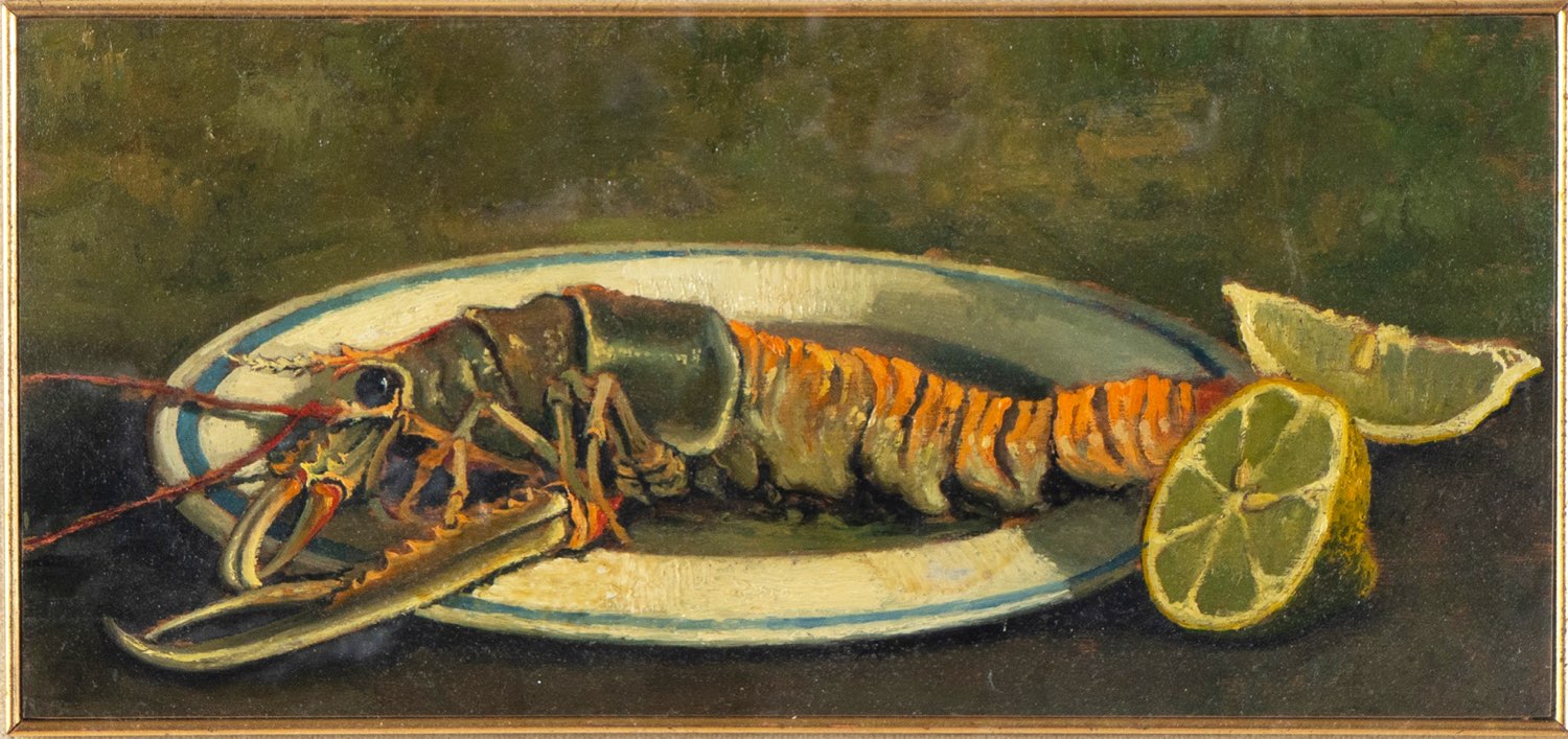 Anonimo degli inizi del XX secolo, “Natura morta con astice e limoni”. Olio su tavoletta, H cm 16x35