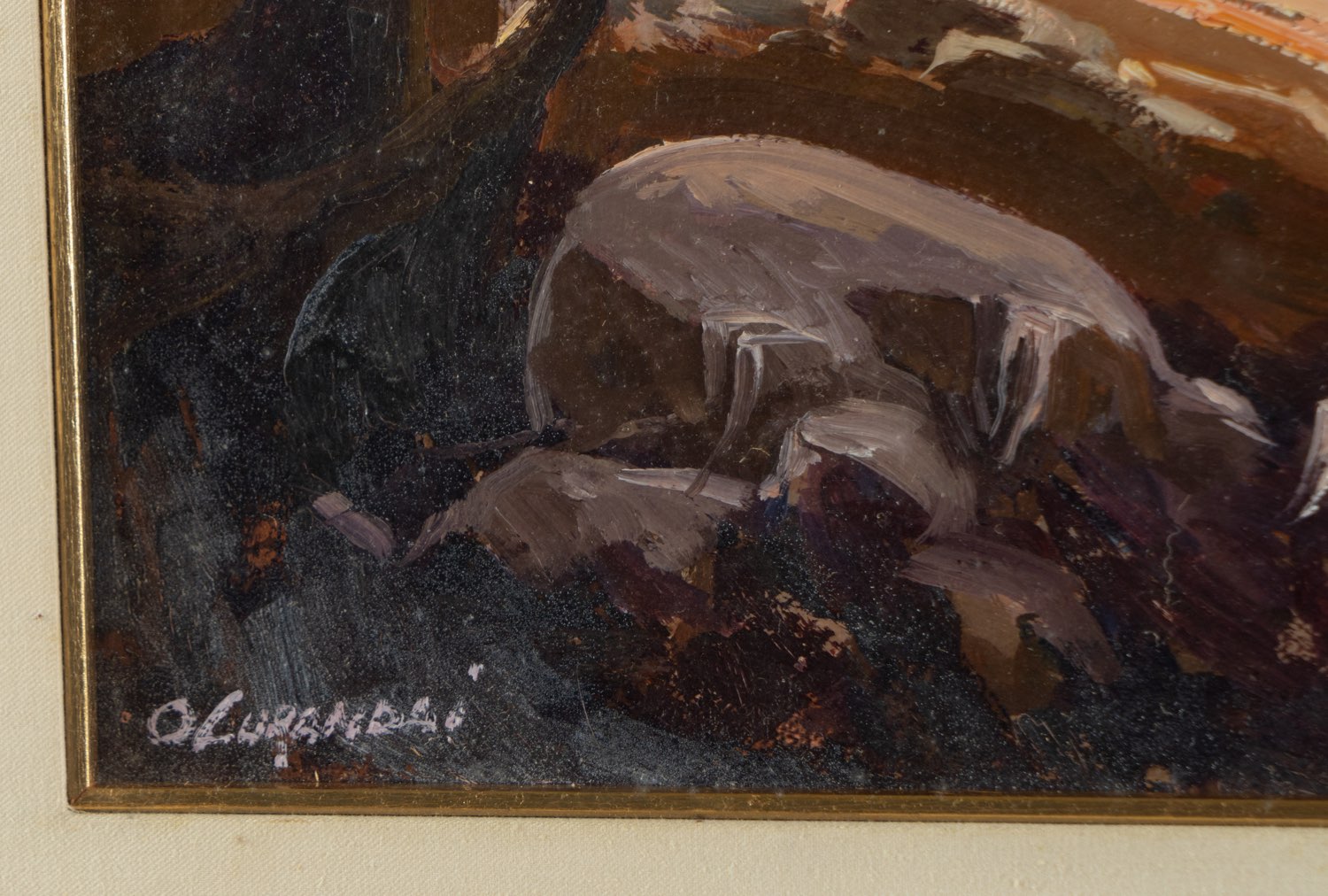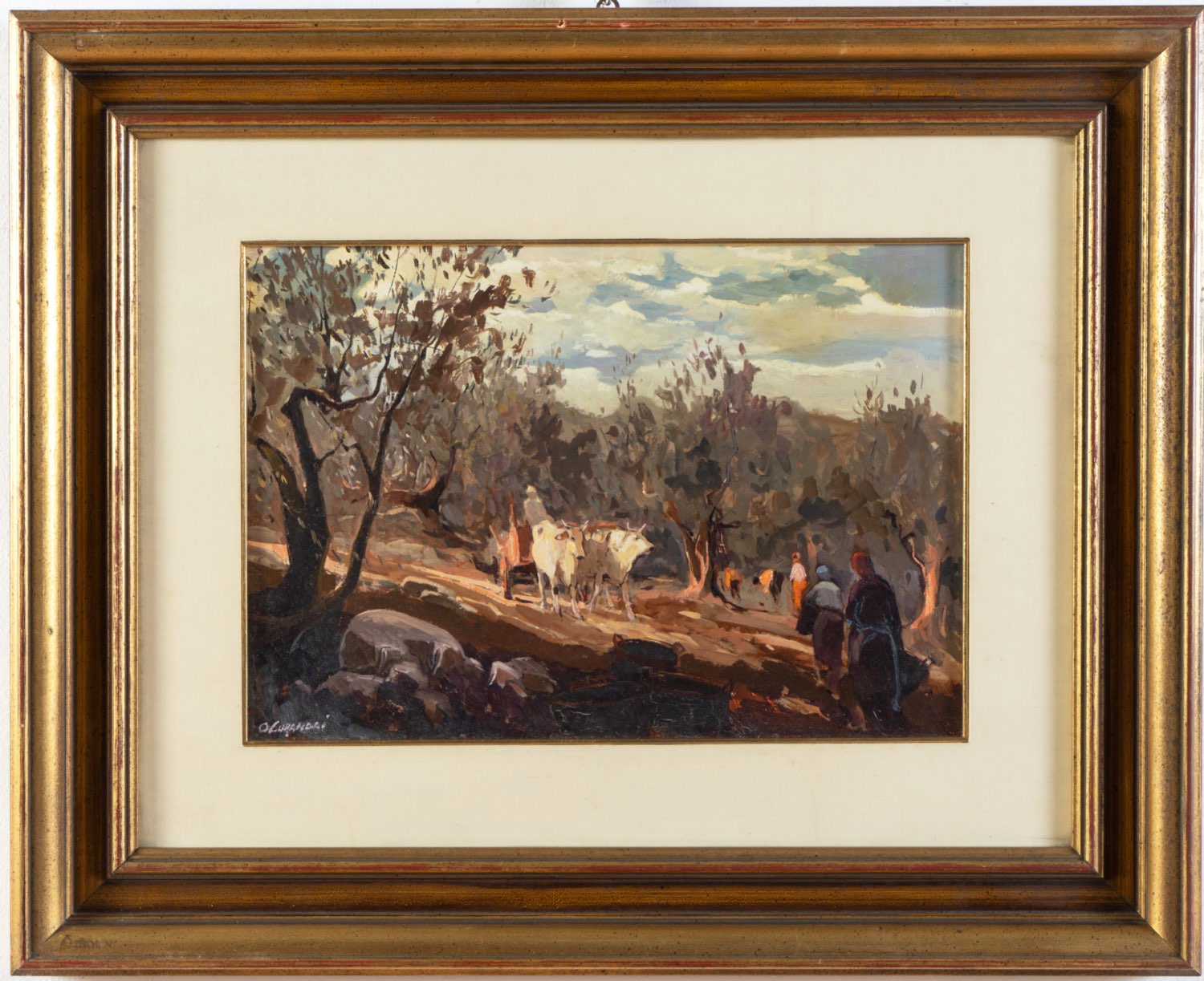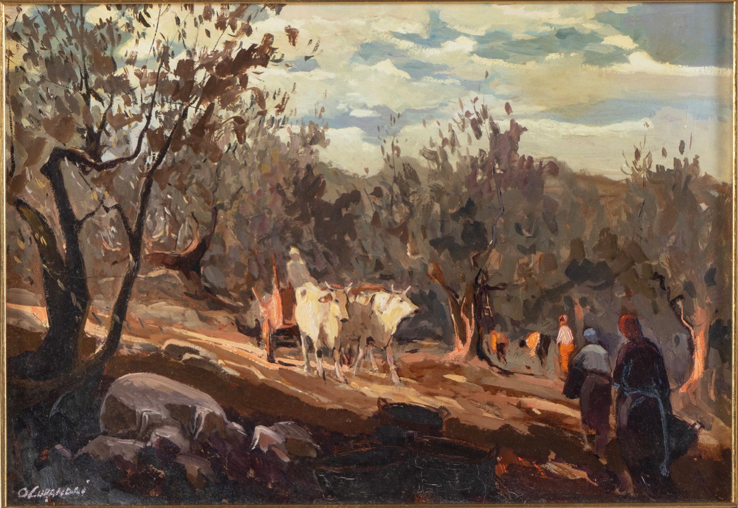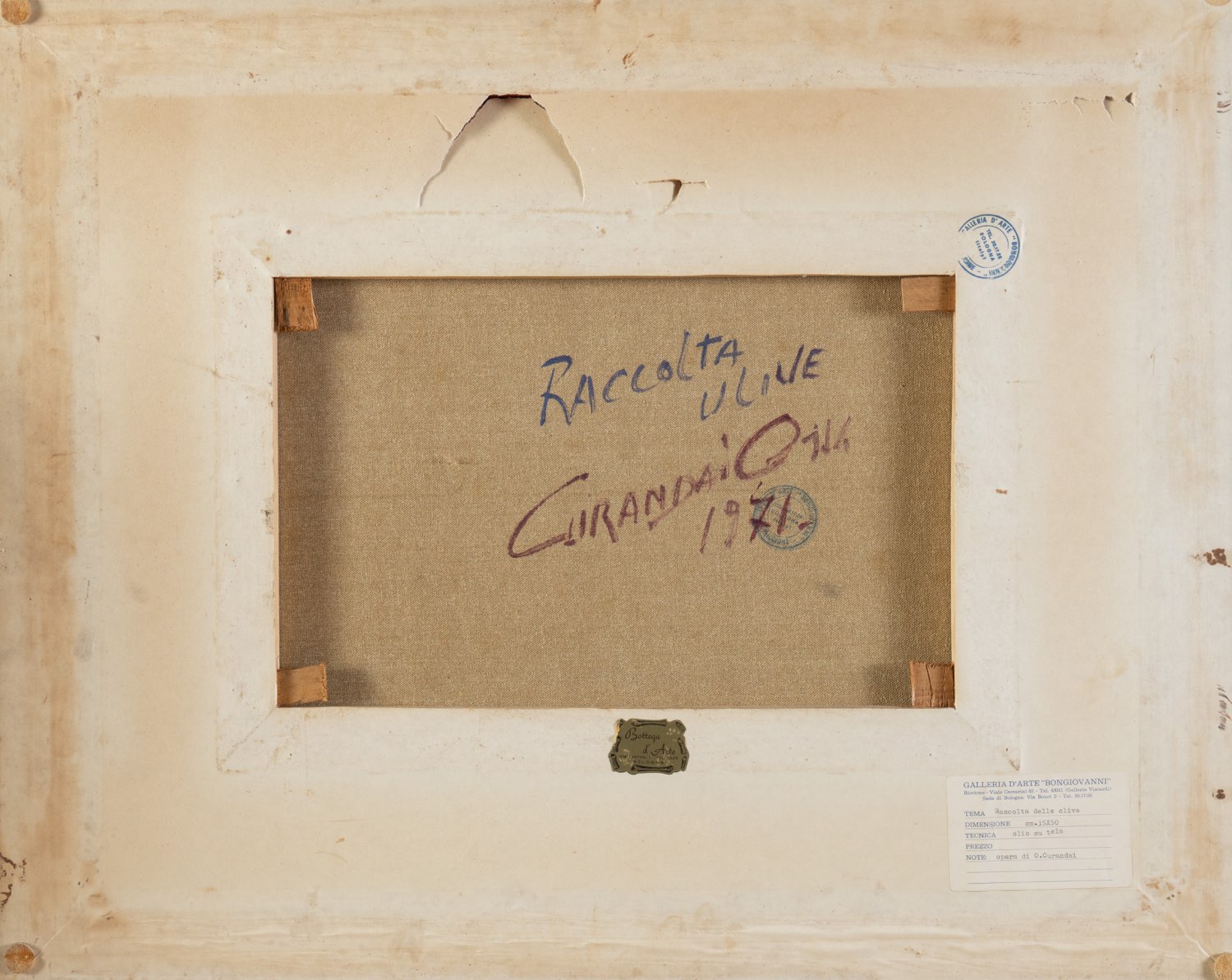 Osvaldo Curandai (Firenze 1931 - Rignano 2019), “Raccolta delle olive”, 1971. Olio su tela, firmato in basso a sinistra, reca al retro iscrizione autografa “Raccolta/Olive/Curandai Osv./1971” e timbri ed etichetta della Galleria d’Arte Bongiovanni - Bologna, H cm 35x50