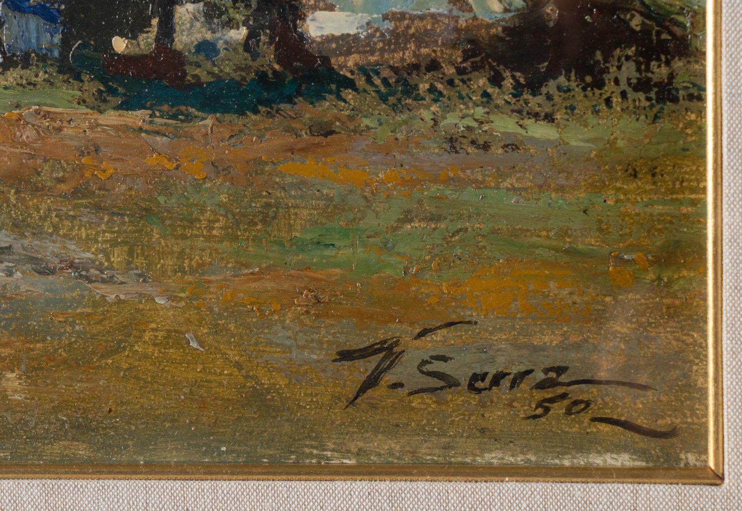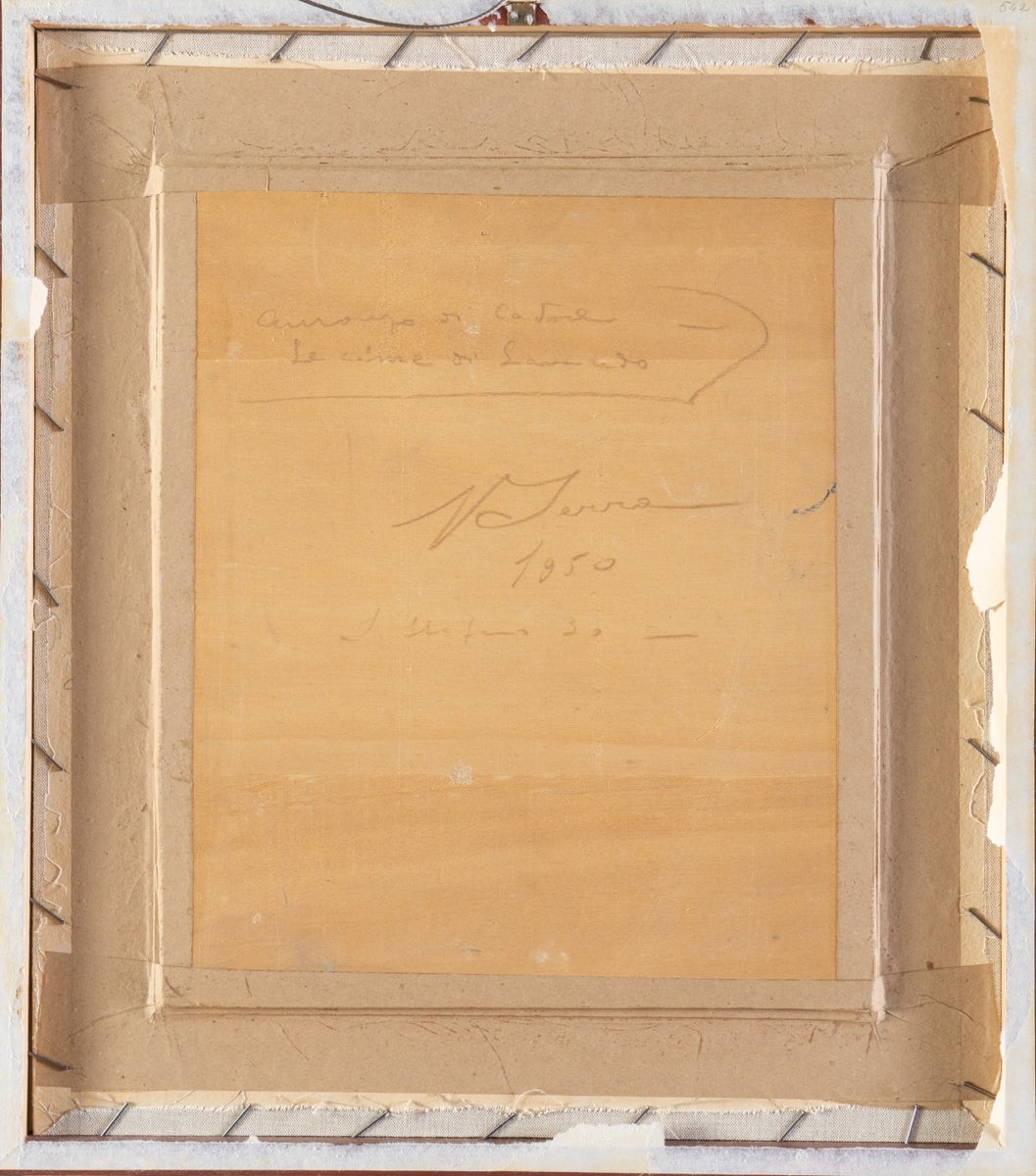 Valentino Serra (San Giovanni in Persiceto 1888 - Baricella 1957), “Le cime di Lavaredo”, 1950. Olio su tavola, firmato e datato in basso a destra, reca al retro iscrizione, firma e data, H cm 38x32