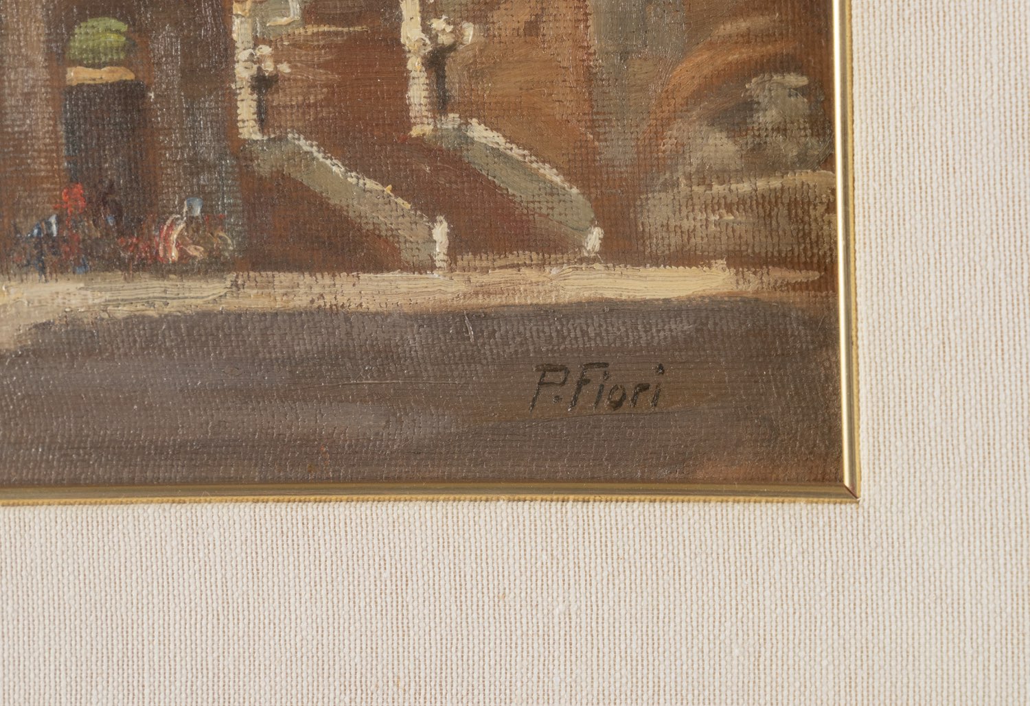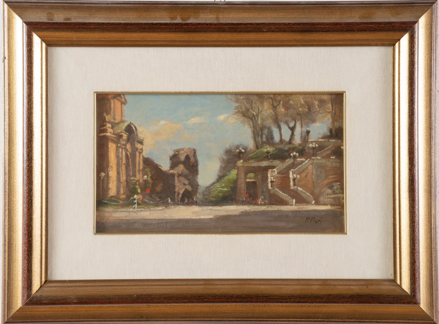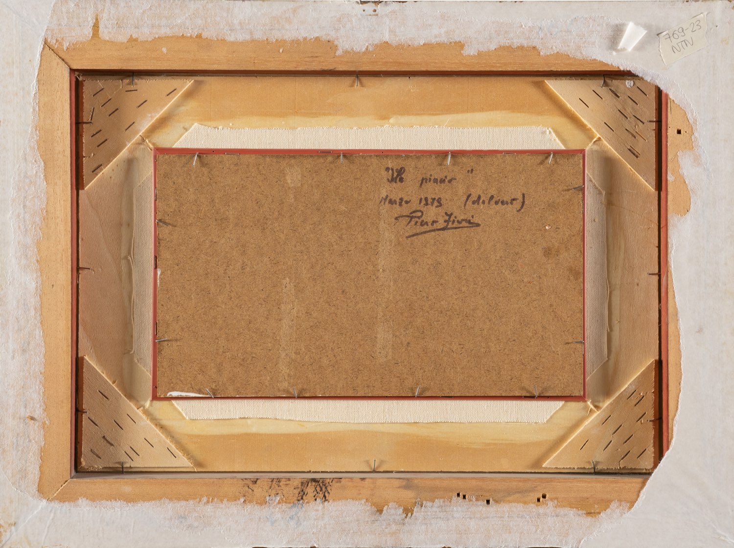 Piero Fiori (Bologna 1947), “La piazza”, 1979. Olio su tela applicata a cartone pressato, firmato in basso a destra, reca al retro iscrizione “La piazza/Marzo 1979 (dal vero)” e firma dell’artista, H cm 20x36