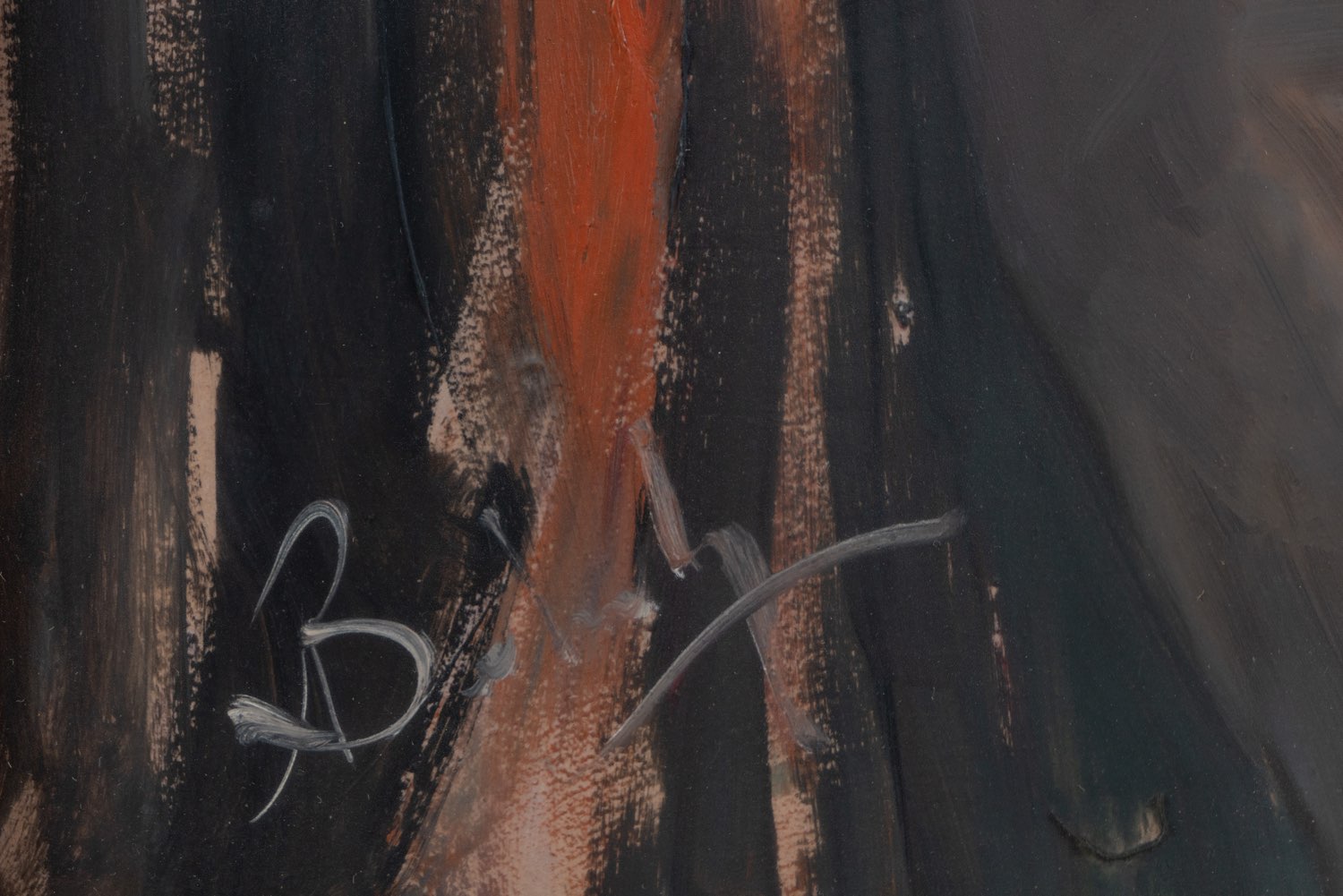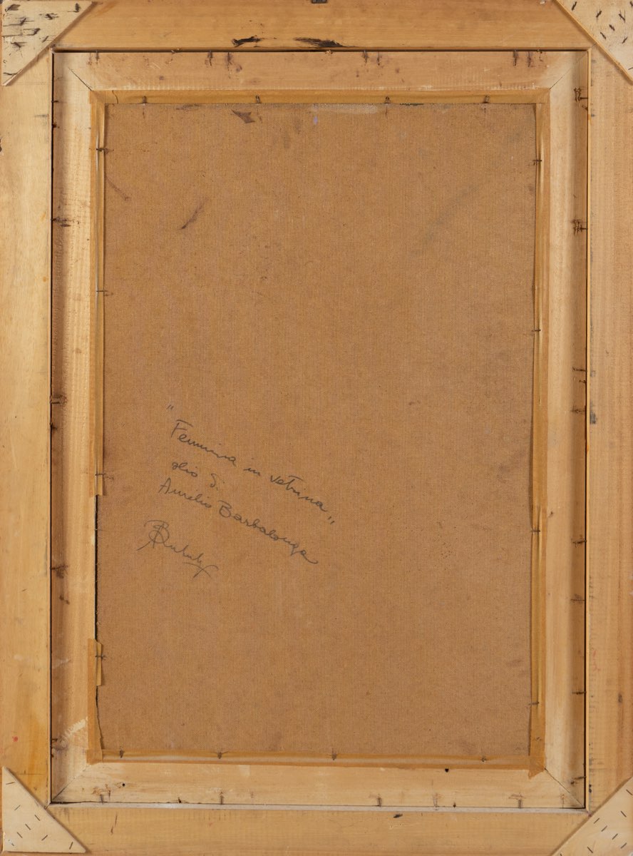 Aurelio Barbalonga (Palermo 1922 - Bologna 2004), “Femmina in vetrina”. Olio su masonite, firmato in basso a sinistra, reca al retro iscrizione “Femmina in vetrina/olio di/Aurelio Barbalonga” e firma dell’artista, H cm 90x60