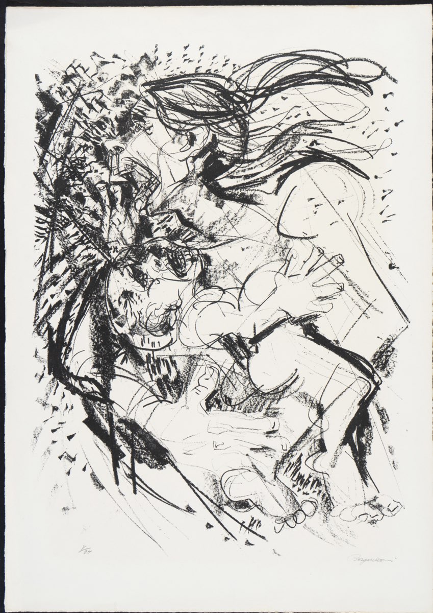 Aldo Borgonzoni (Medicina 1913 - Bologna 2004), “Senza titolo”. Incisione su carta, firmata in basso a destra “Borgonzoni”, numero di tiratura in basso a sinistra 7/25, Foglio H cm 70x50 (lieve difetto al foglio)