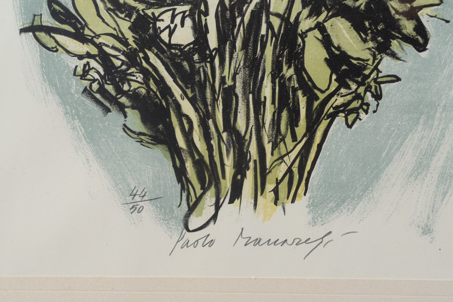 Paolo Manaresi (Bologna 1908 - 1991), “Mazzo di fiori”. Litografia a colori su carta, firmata in basso al centro “Paolo Manaresi”, numero di tiratura in basso a sinistra 44/50, reca al retro etichetta della XI Nazionale d’Arte Figurativa della Città di Imola Settembre - Ottobre 1969, H cm 65x48