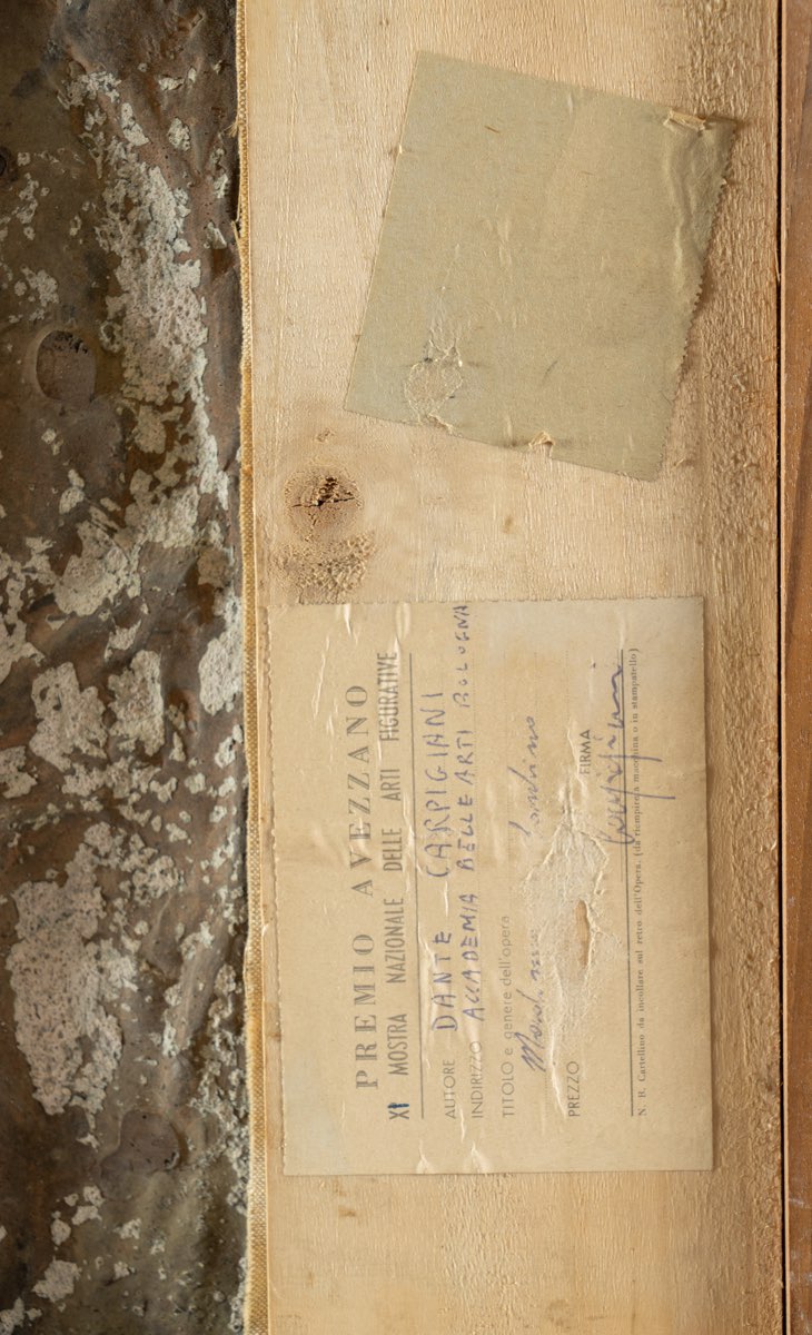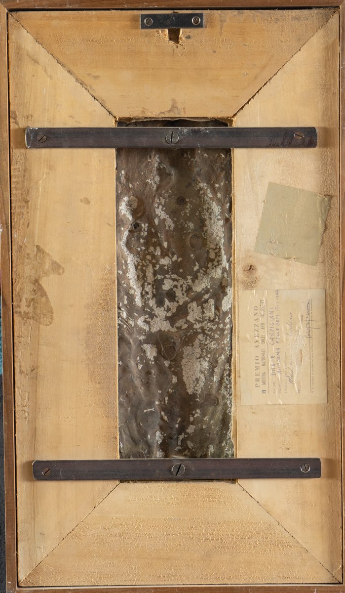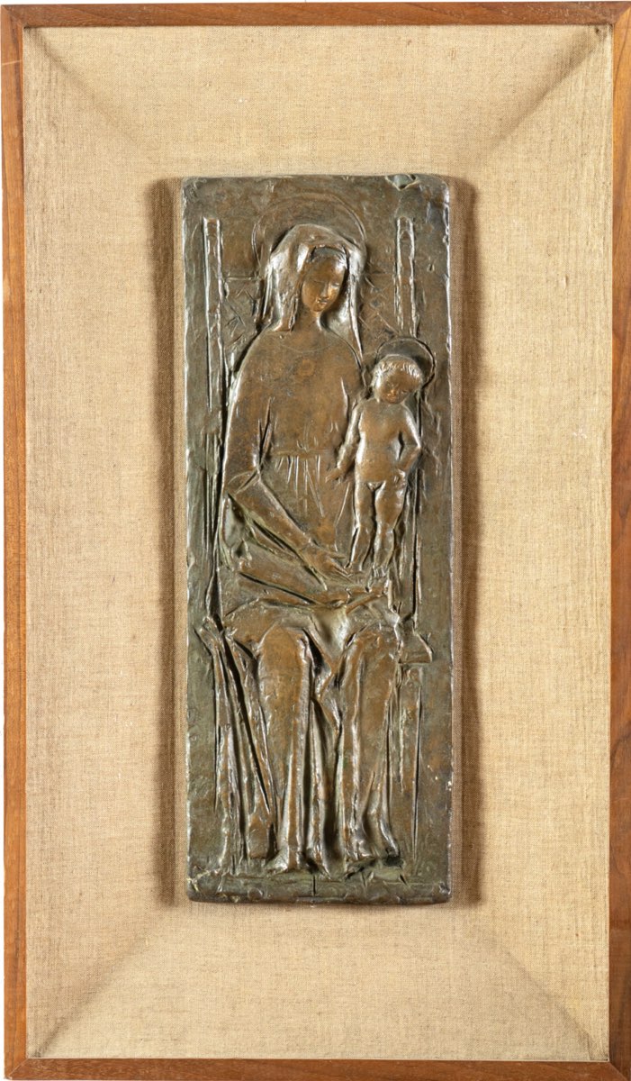Dante Carpigiani (Guastalla 1921), “Madonna con Bambino”. Altorilievo su lastra in bronzo, reca al retro etichetta del Premio Avezzano - XI Mostra Nazionale delle Arti Figurative, H cm 39x14 - con cornice H cm 58x33