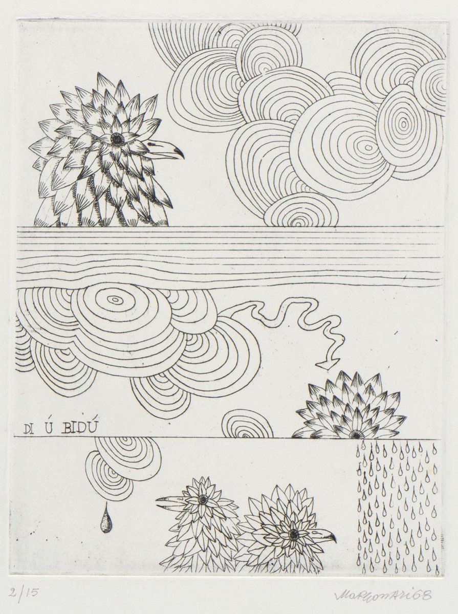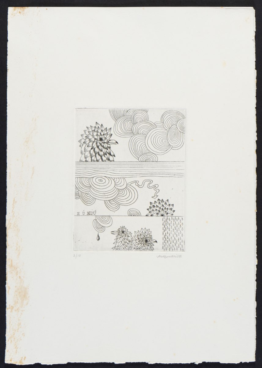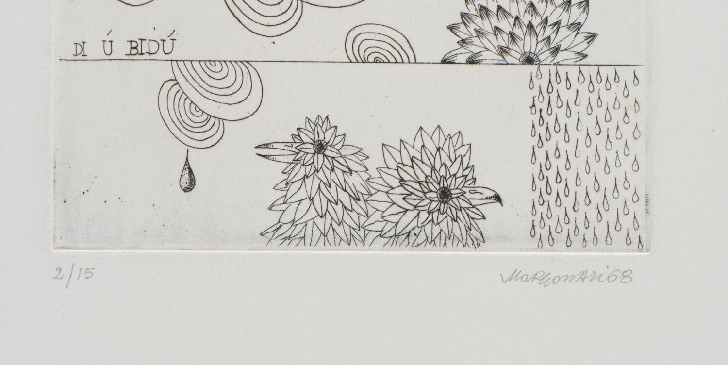Renzo Margonari (Mantova 1937), “Di ù bidù”, 1968. Incisione su carta, firmata e datata in basso a destra “Margonari 68”, numero di tiratura in basso a sinistra 2/15, Lastra H cm 20x15.5 (difetti al foglio)