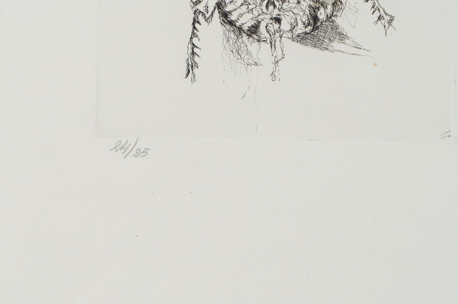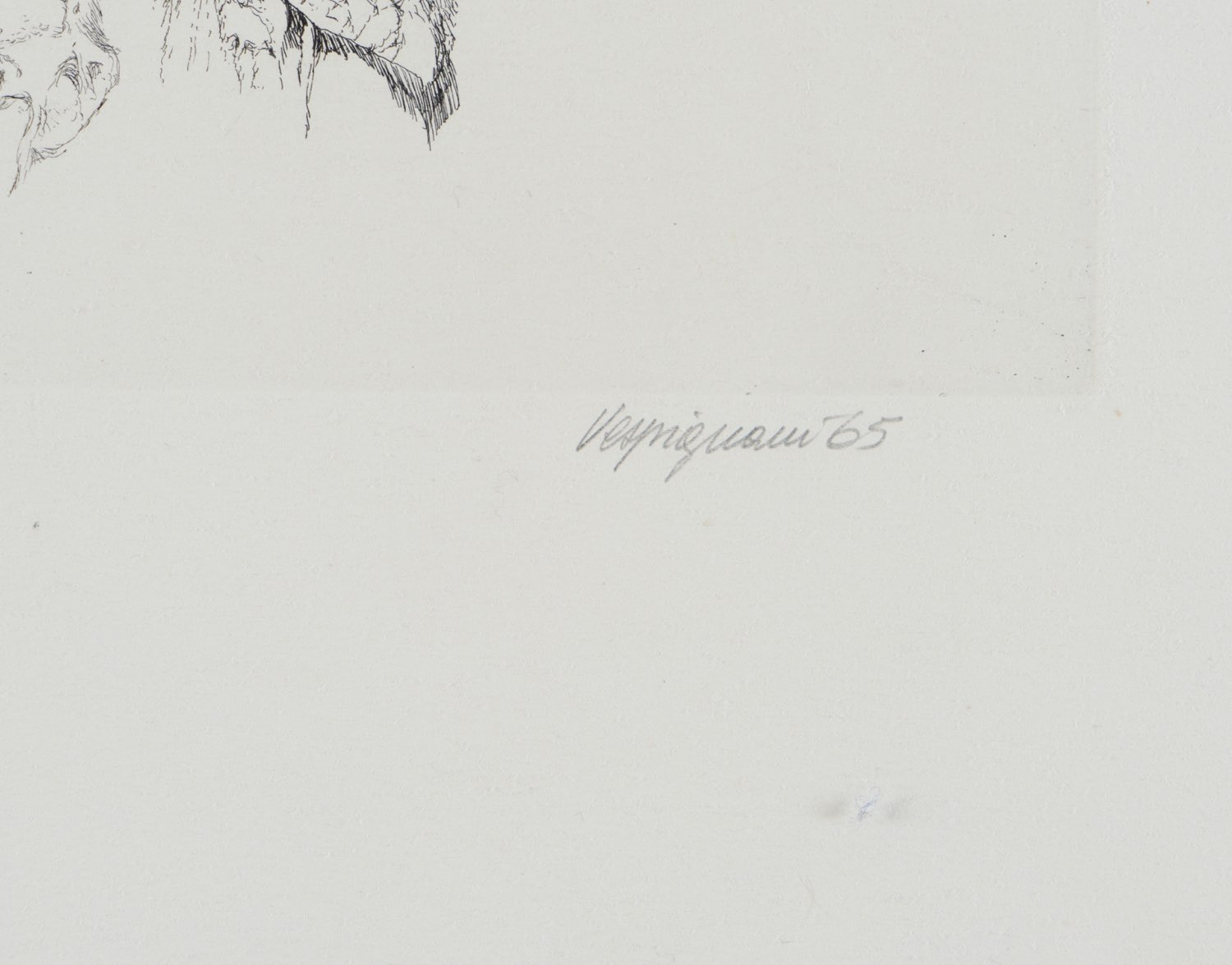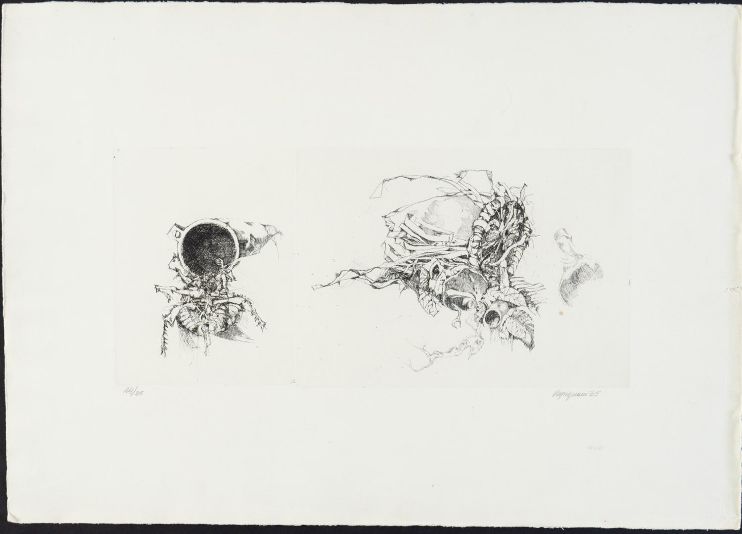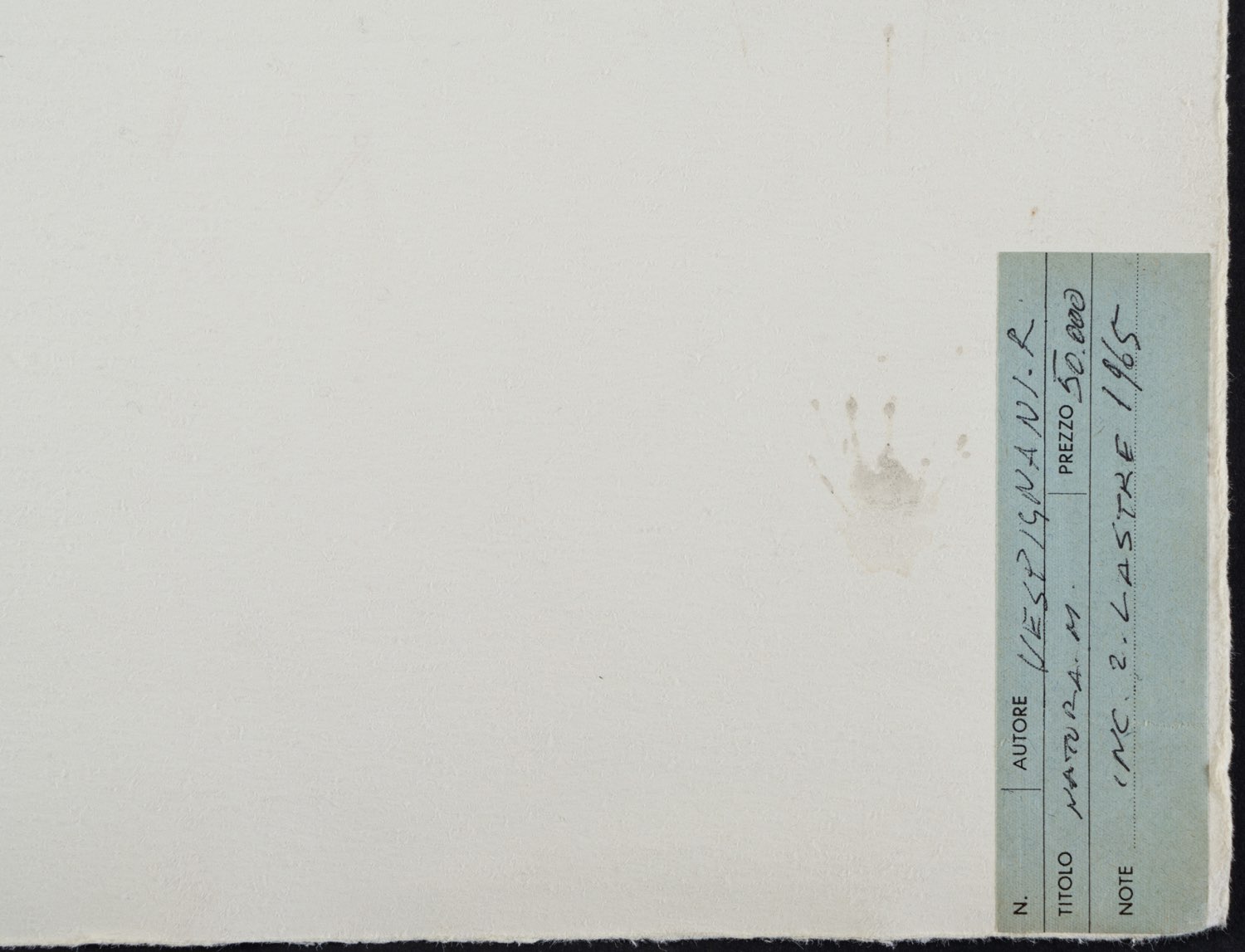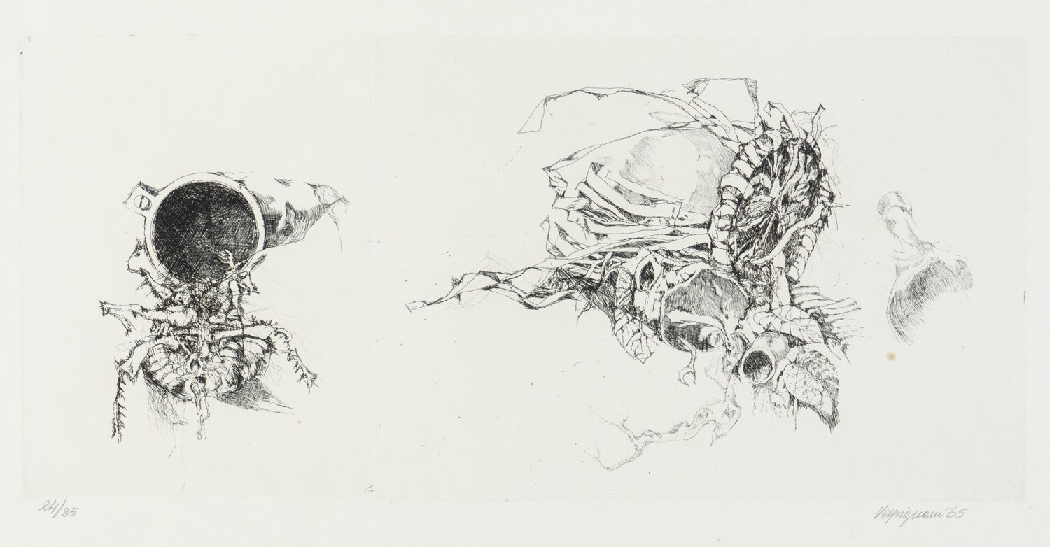 Renzo Vespignani (Roma 1924 - 2001), “Natura morta”, 1965. Incisione su carta, firmata e datata in basso a destra “Vespignani 65”, numero di tiratura in basso a sinistra 24/25,presenta etichetta al retro, Lastra H cm 23x49.5 (lievi difetti al foglio)