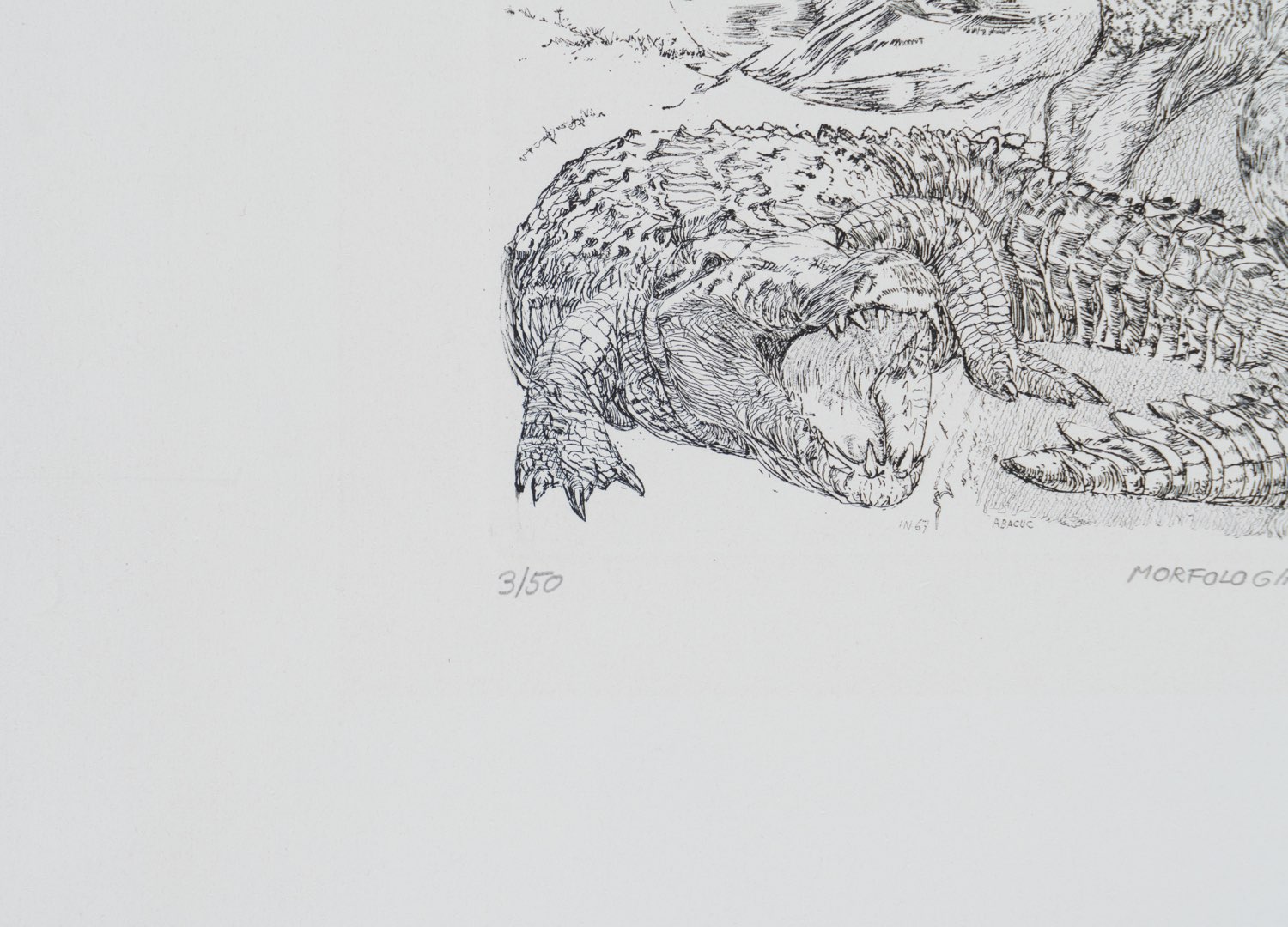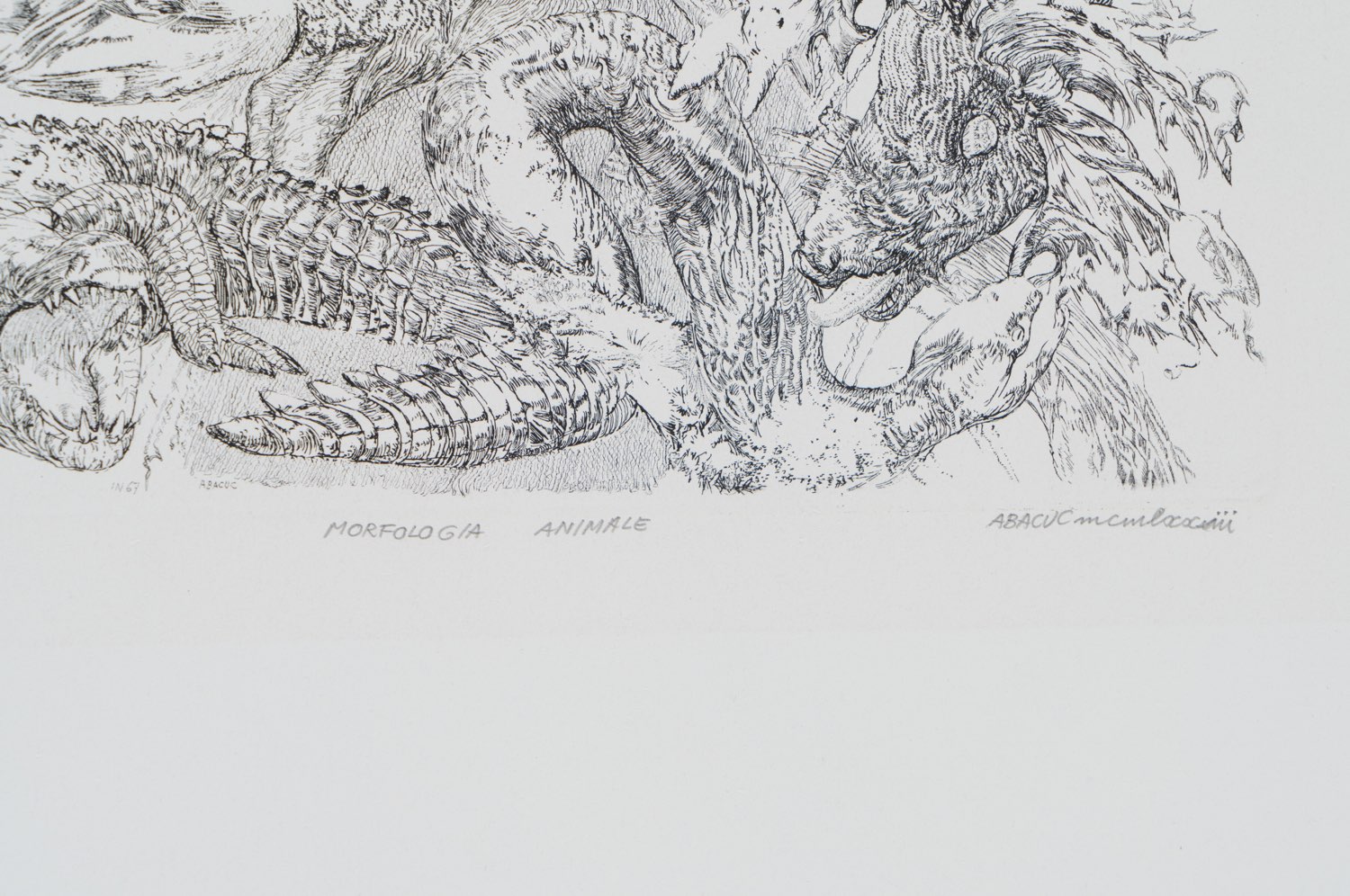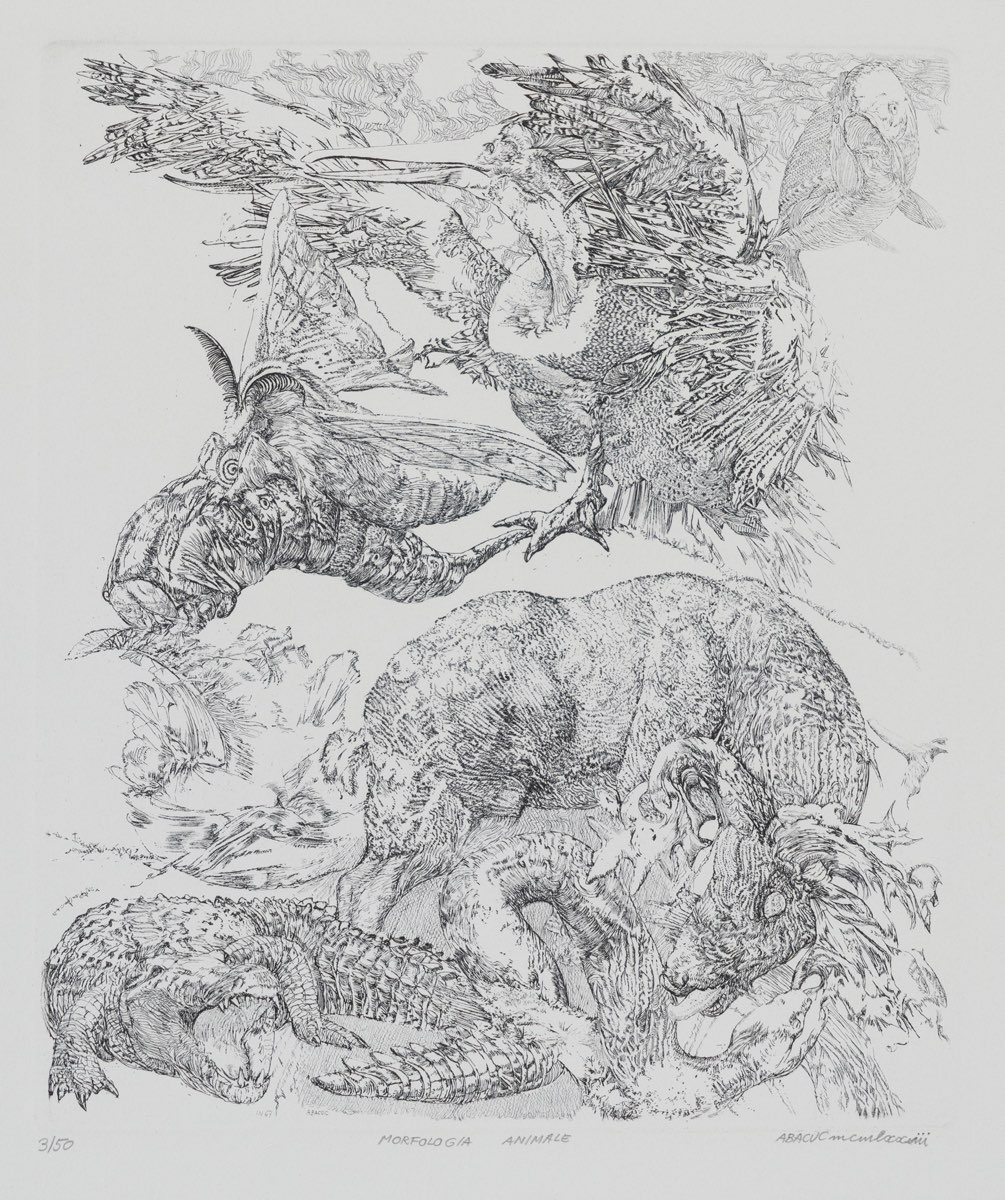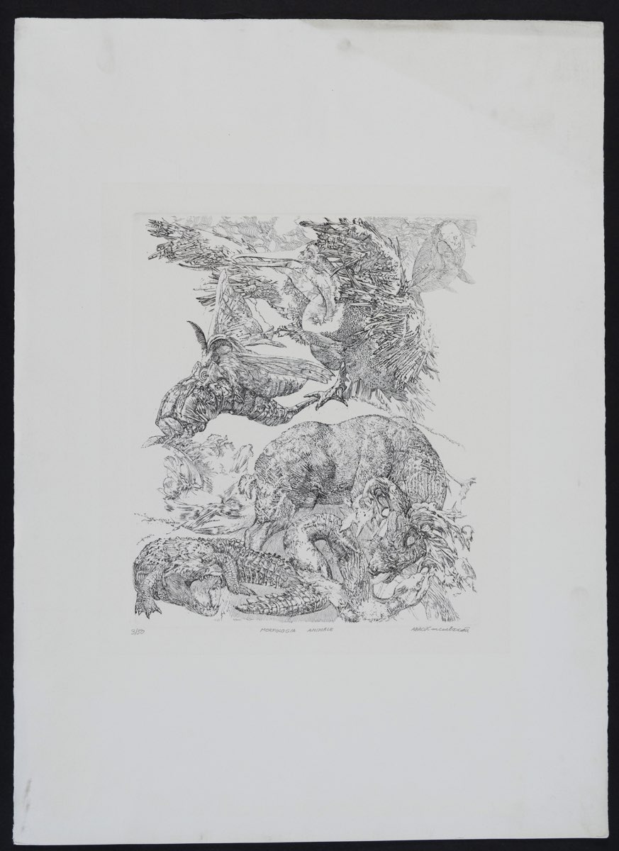 Silvano Girardi detto Abacuc (Torino 1933 - 2021), “Morfologia animale”, 1973. Acquaforte su carta, firmata e datata in basso a destra “ABACUC mcmlxxiii”, numero di tiratura in basso a sinistra 3/50, presenta titolo in basso al centro, reca timbro secco Comune di Verona Musei d’Arte, Lastra H cm 34.5x29