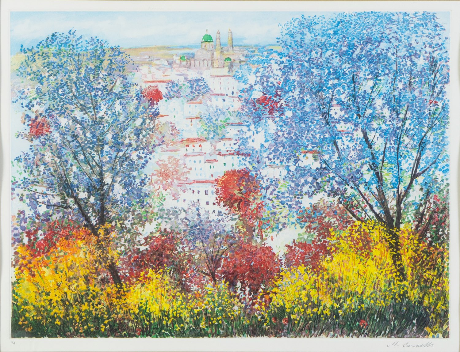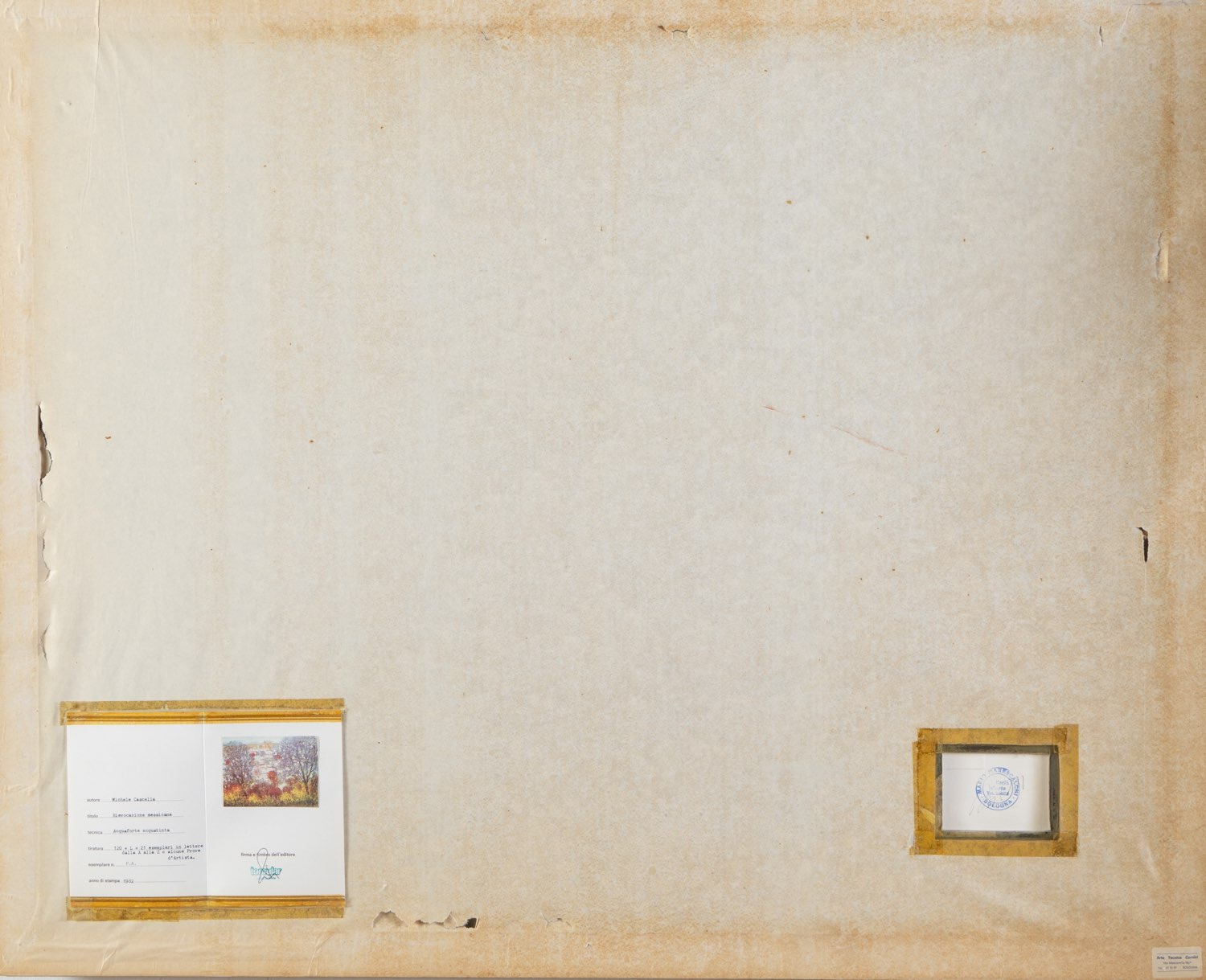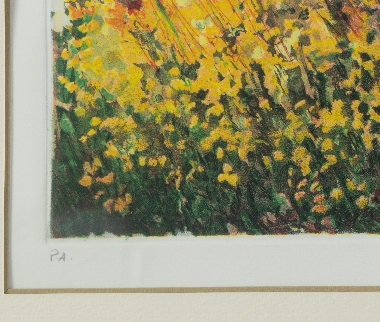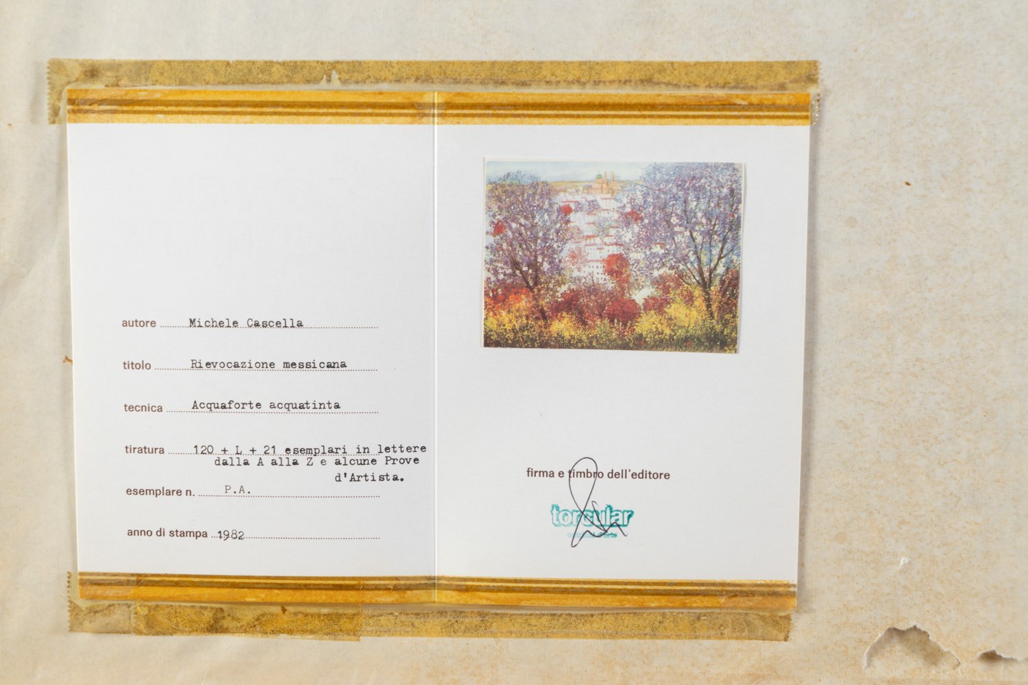 Michele Cascella (Ortona 1892 - Milano 1989), “Rievocazione messicana”, 1982. Acquaforte acquatinta a colori su carta, firmata in basso a destra, esemplare in basso a sinistra P.A., reca al retro timbro e firma della Galleria Marescalchi - Bolognae pieghevole e garanzia di autenticità a cura di Torcular - Milano, Lastra H cm 44.5x59