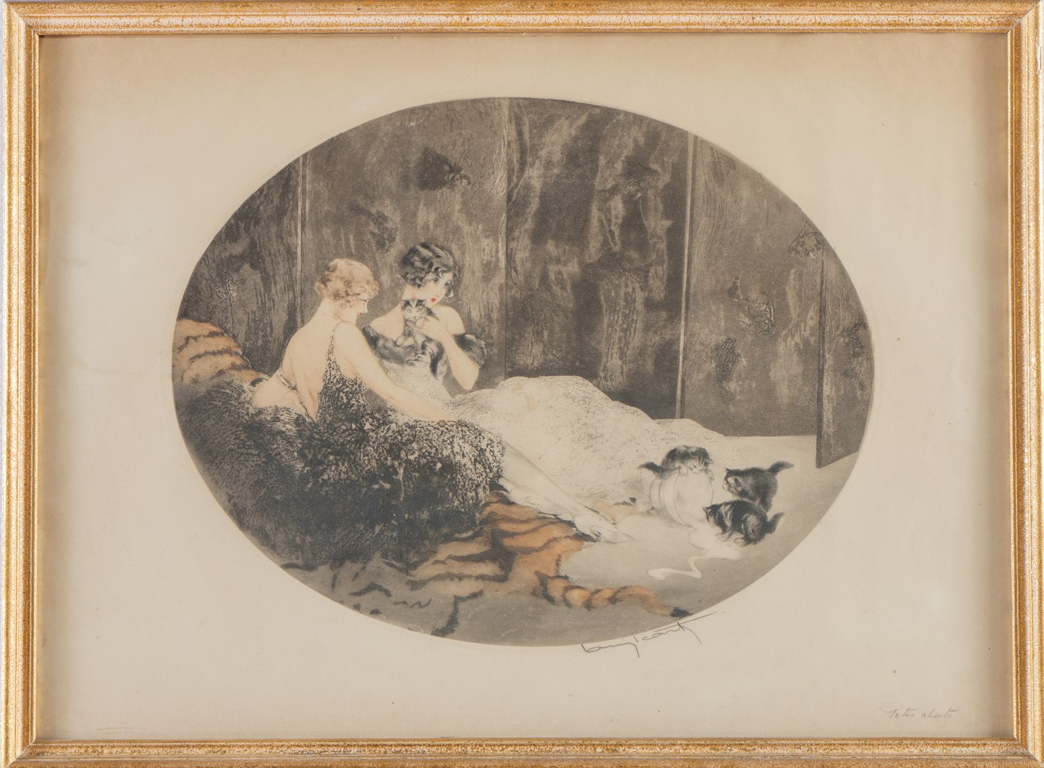 Louis Icart (Tolosa 1888 - Parigi 1950), “Spilled milk”, 1925. Acquaforte a colori su carta, firmata in basso a destra, reca iscrizione a matita “Petits chats”, Lastra H cm 41x53