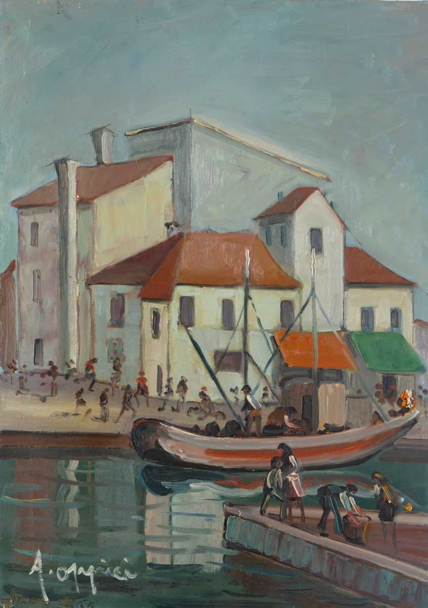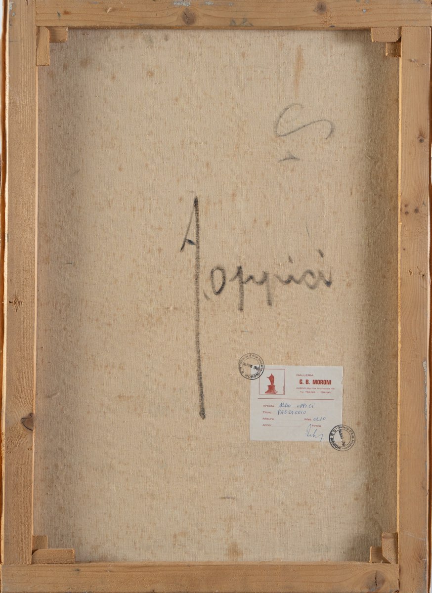 Aldo Oppici (Sabbioneta 1908 - Vimodrone 1985), “Paesaggio”. Olio su tela, firmato in basso a sinistra, reca al retro firma dell’artista ed etichetta e timbri della Galleria G. B. Moroni - Albino con autore, titolo e tecnica, H cm 70x50