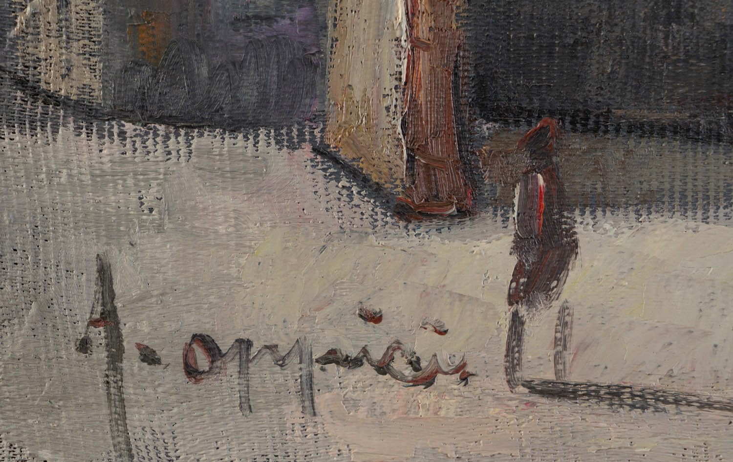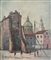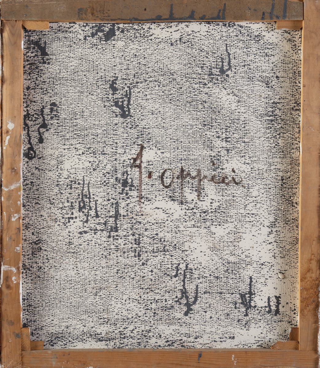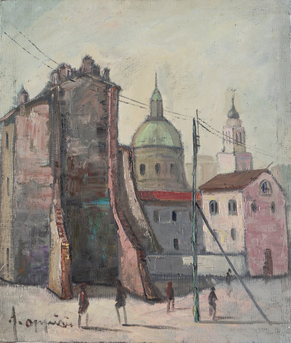 Aldo Oppici (Sabbioneta 1908 - Vimodrone 1985), “Scorcio cittadino”. Olio su tela, firmato in basso a sinistra, reca al retro firma, H cm 70x60