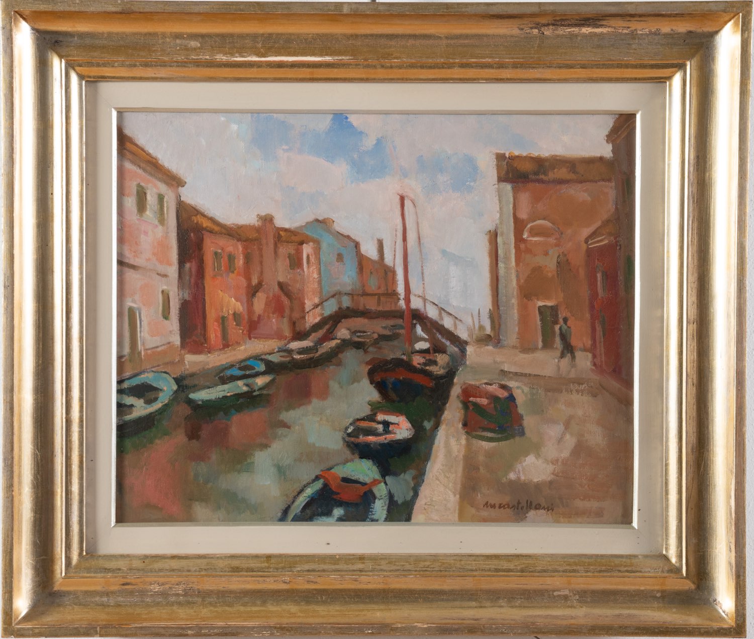 Mario Castellani (Genova 1914 - 1985), “Burano”. Olio su tela, firmato in basso a destra, reca al retro firma, titolo ed etichetta e timbro Club dell’Arte - Milano, H cm 40x50 - Opera accompagnata da certificato di autenticità su fotografia a cura di Club dell’Arte - Milano.