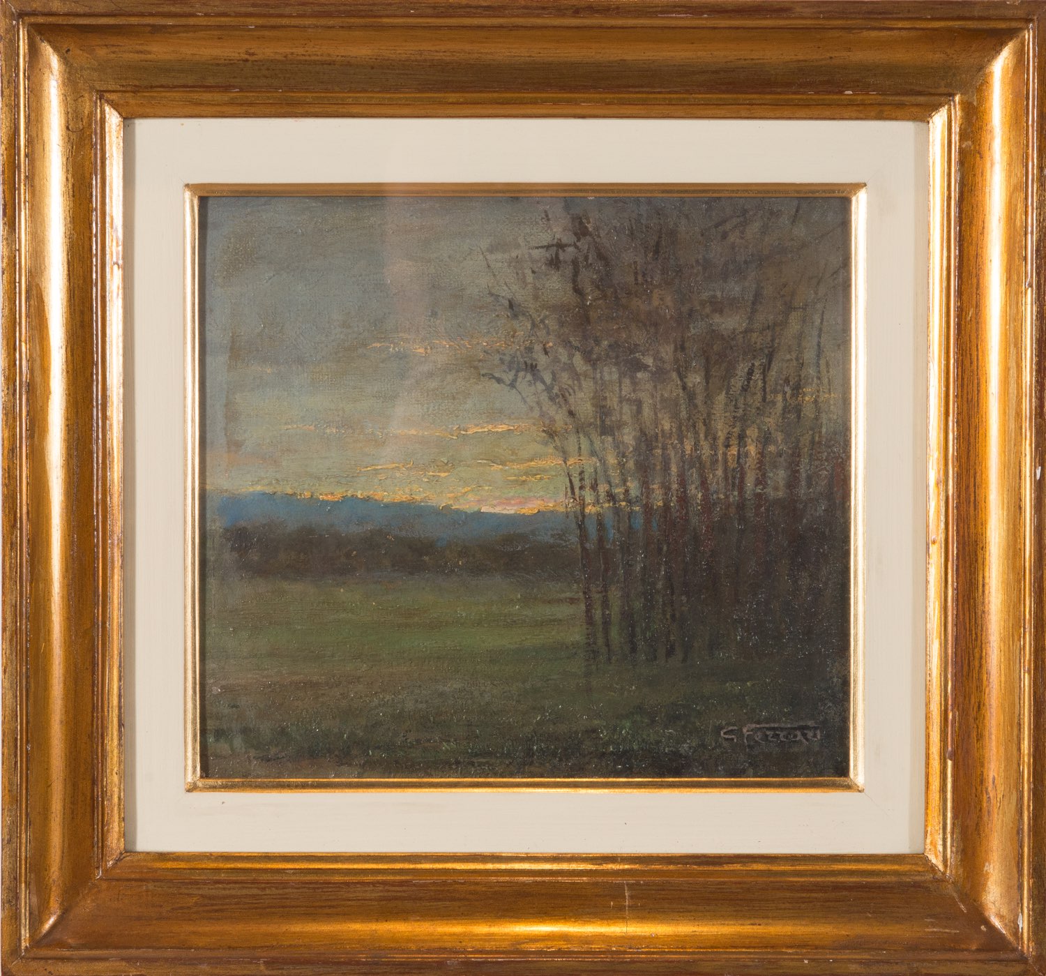 Artista del XX secolo, “Paesaggio all'imbrunire”. Olio su cartone telato, firmato in basso a destra G. Ferrari, H cm 21x24