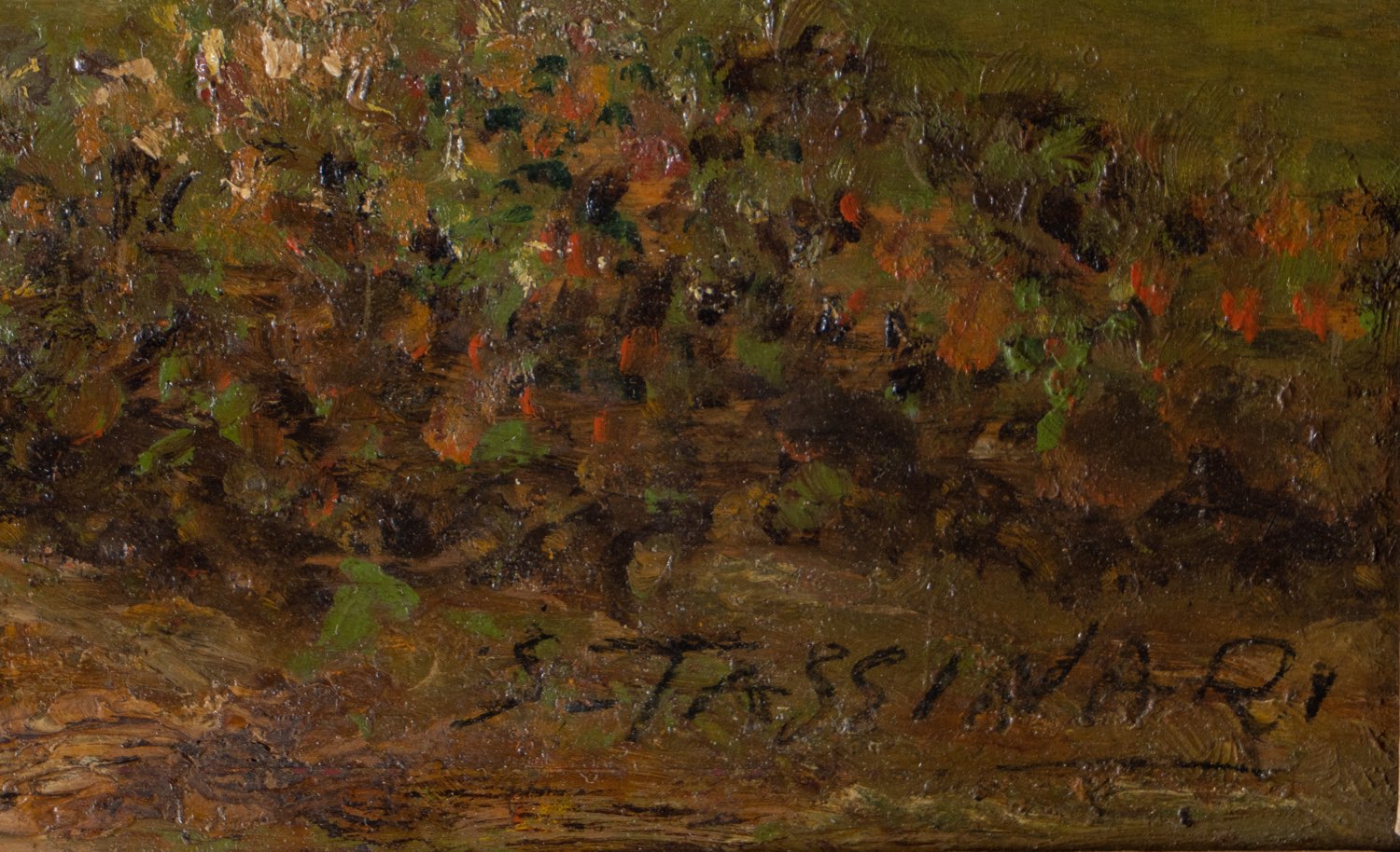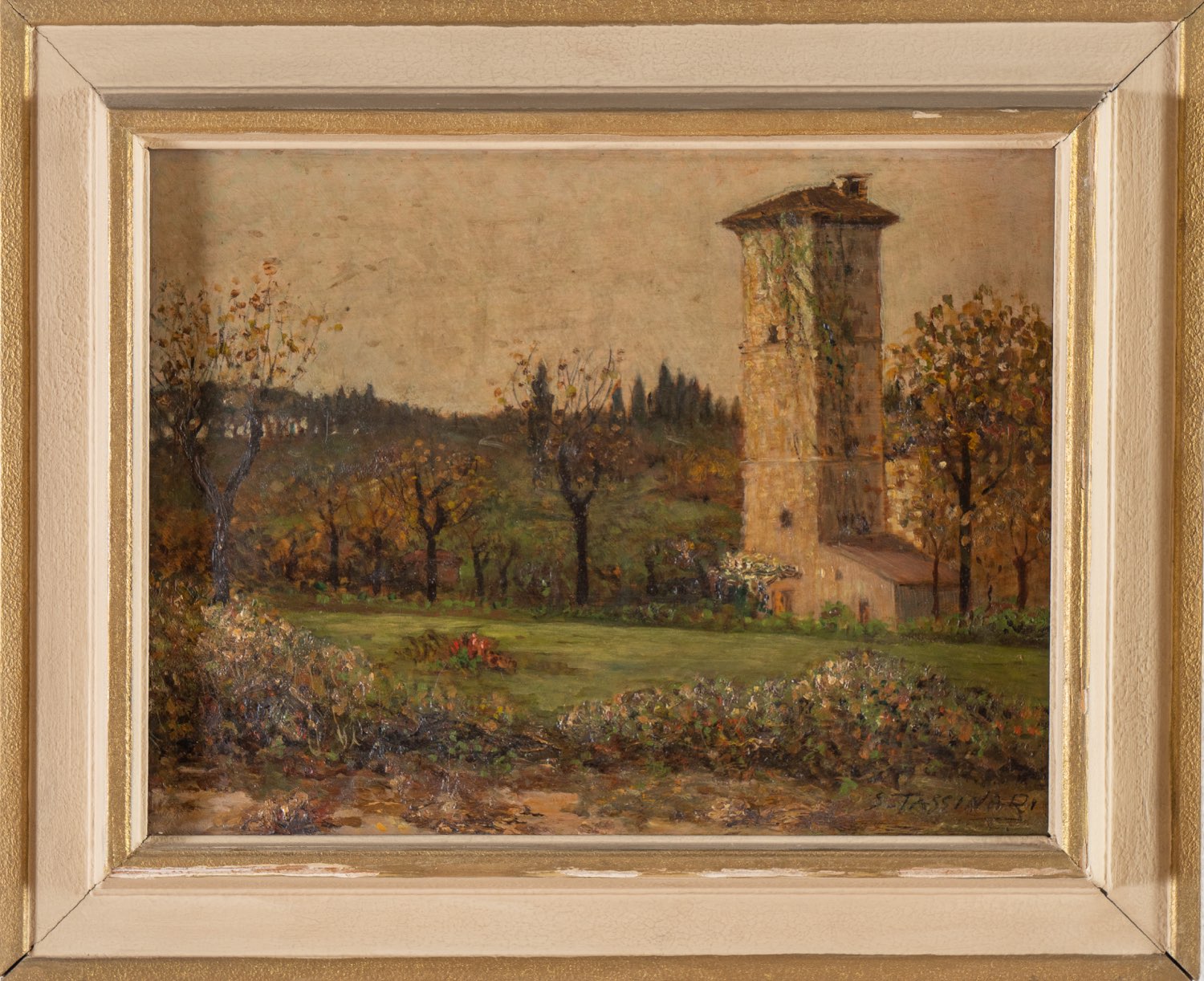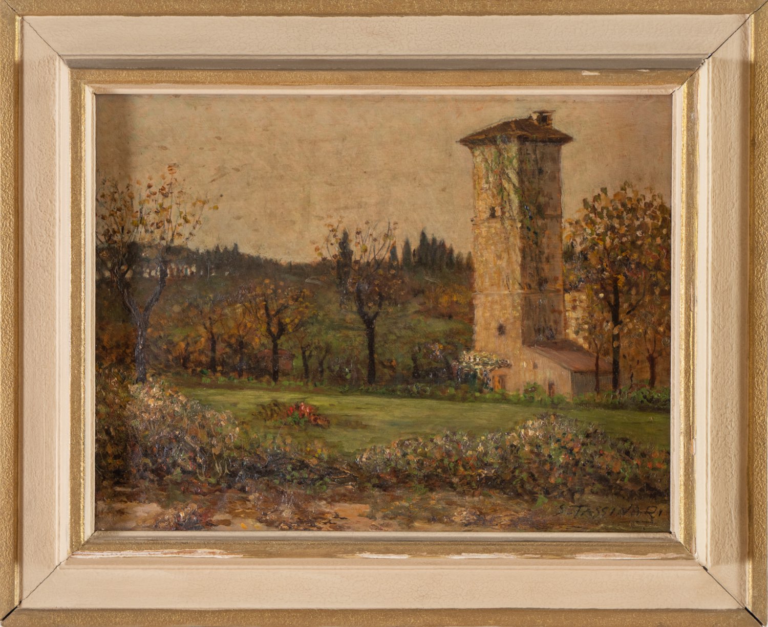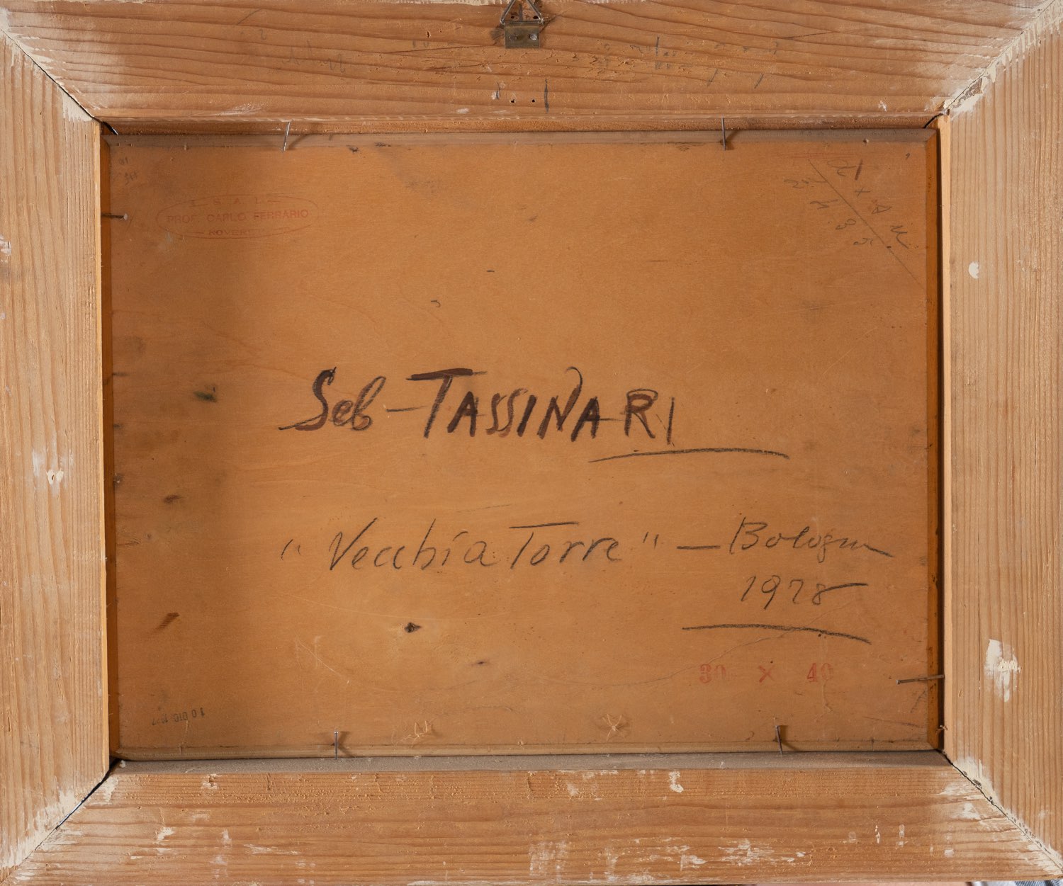 Gino Tassinari (Livorno 1920 - 2001), “Vecchia Torre”, 1928. Olio su tavola, firmato in basso a destra “G. Tassinari”, reca al retro firma, titolo, luogo e data, H cm 30x40