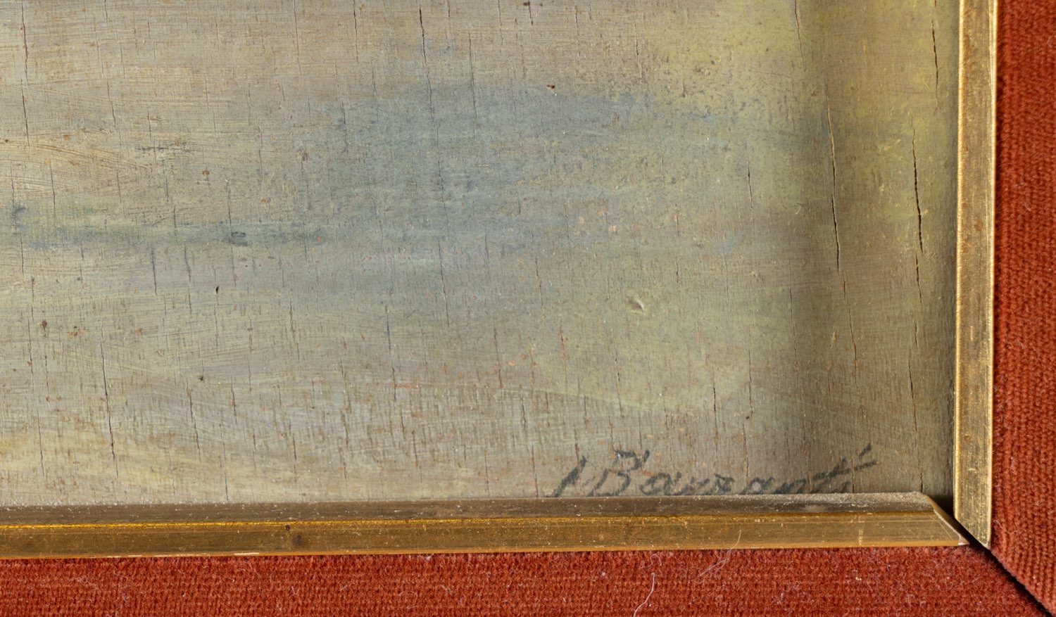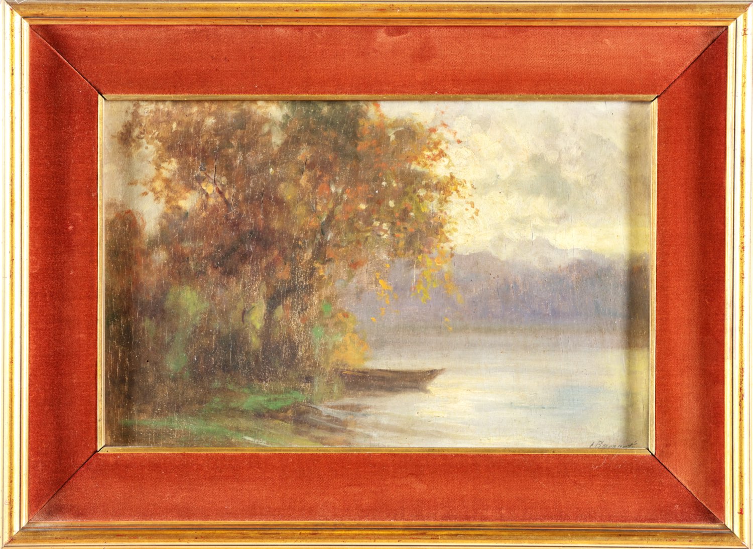 Licinio Barzanti (Forlì 1857 - Como 1944), “Paesaggio lacustre”. Olio su tavola, firmato in basso a destra “L. Barzanti”, reca al retro etichetta da “Comanducci - Pittori italiani dall’800”, p. 39, H cm 29x44