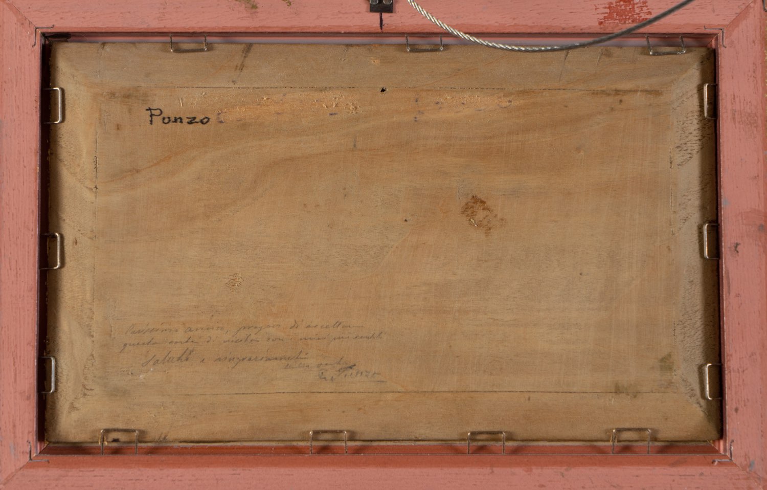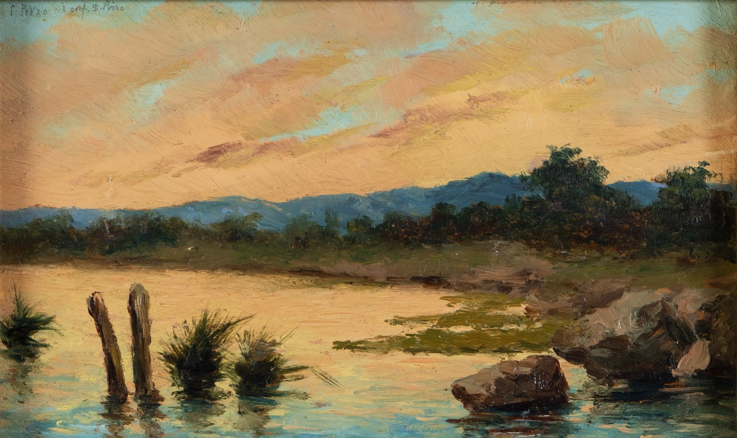 Ciro Punzo (Napoli 1850 - 1925), “Paesaggio lacustre”. Olio su tavola, presenta firma e dedica in alto a sinistra “C. Punzo al prof. D. Pirro”, reca al retro dedica a firma dell’artista, H cm 13.5x23 - Opera accompagnata da certificato di garanzia a cura della Casa d’Aste - Galleria Santa Giulia - Brescia.