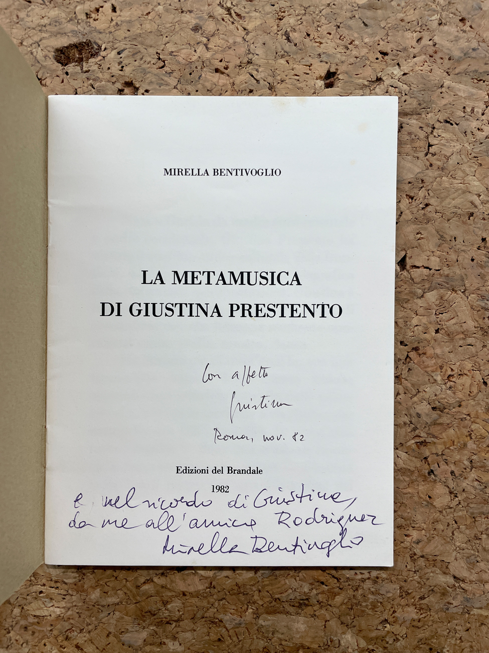 Reca firma e dedica di Giustina Prestento e Mirella Bentivoglio all'interno