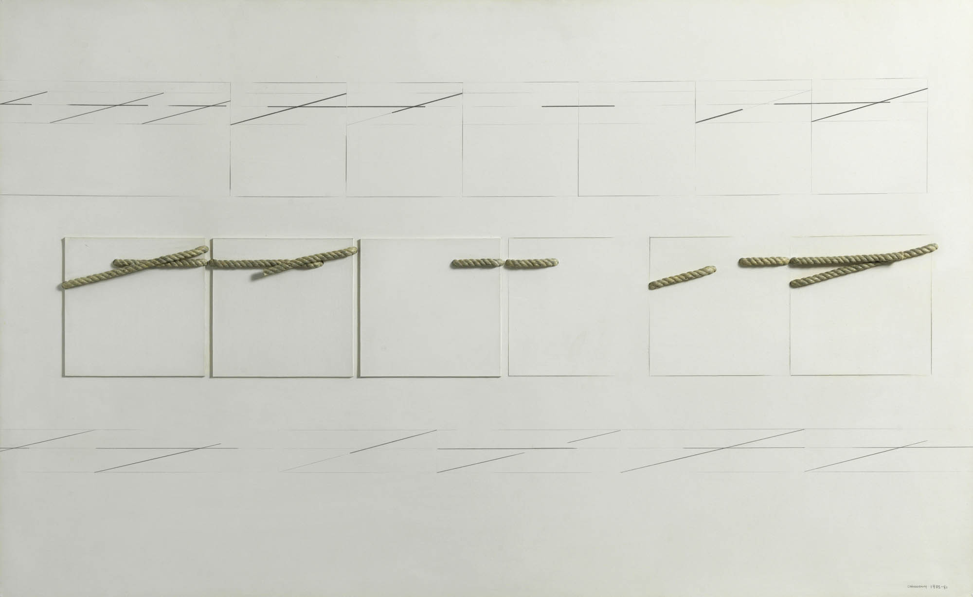 Matita e collage di cartoni e corde su cartone, cm. 49 x 79,5
