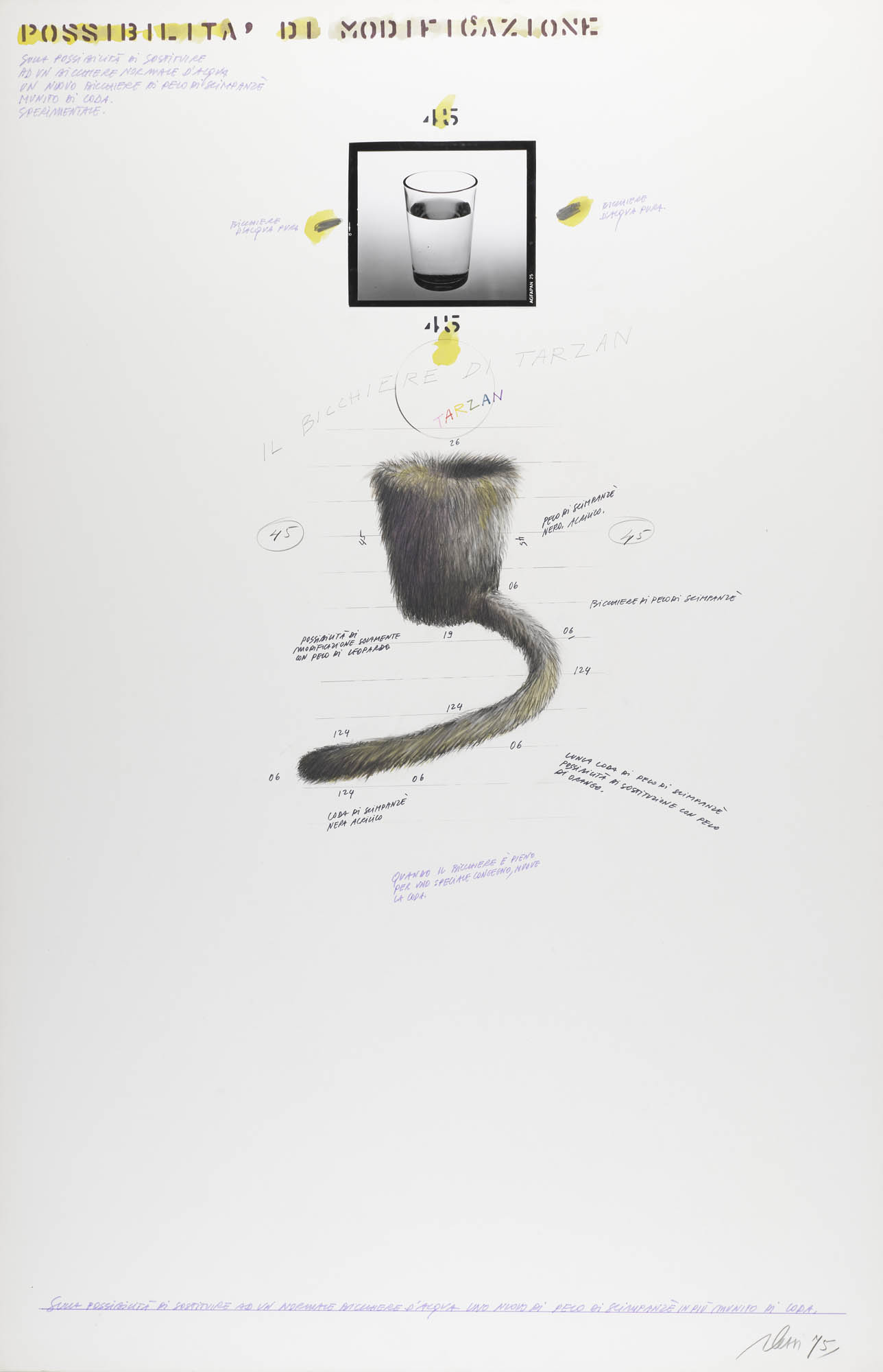FABRIZIO PLESSI Sulla possibilità di sostituire ad un normale bicchiere d'acqua uno nuovo di pelo di scimpanzé in più munito di coda, 1975