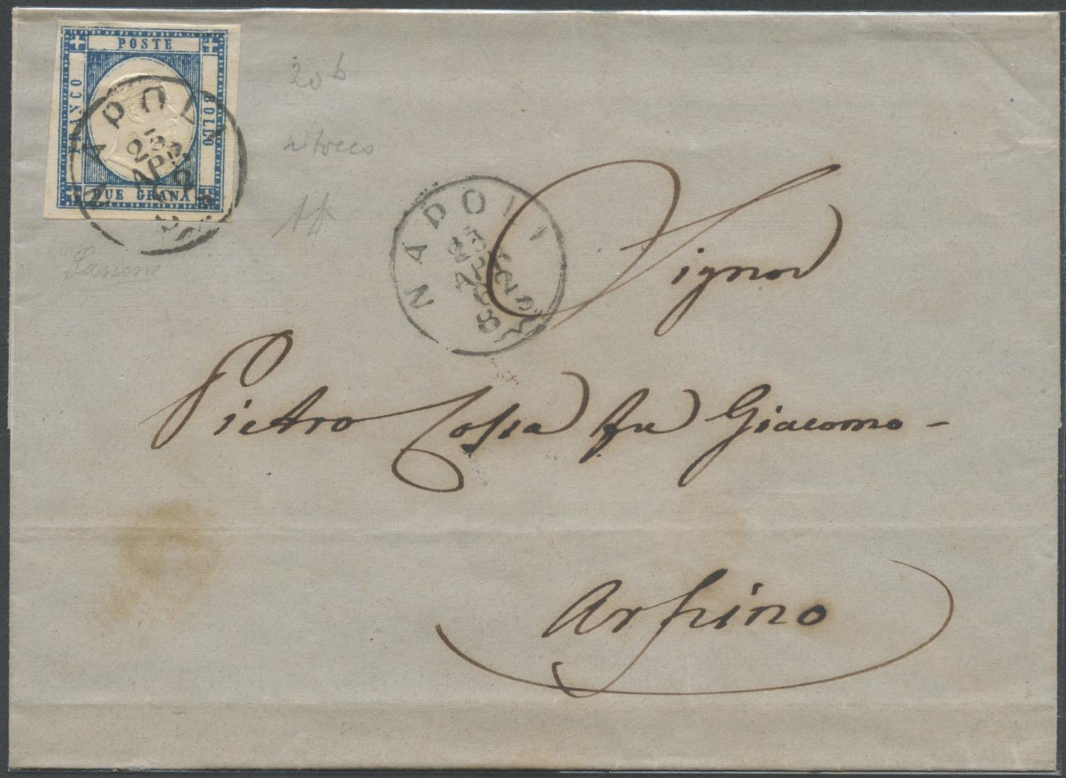 23.04.62, Lettera da Napoli per Arpino affrancata con un 2gr. Appartenente alla ''tavola dei 100 ritocchi''. Molto interessanti gli esemplari conservati su lettera. (Lux) (Sassone, A. Diena)