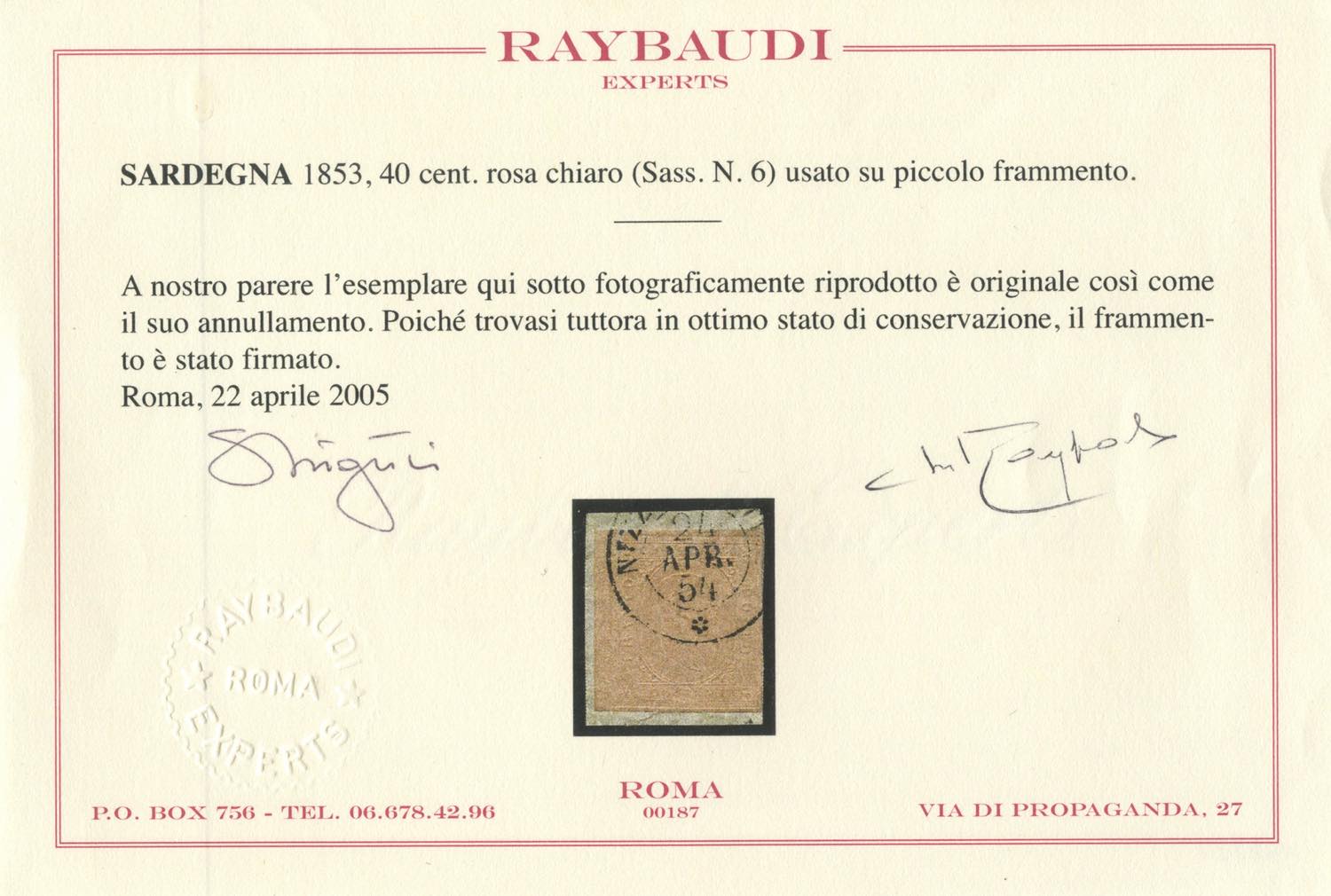 1853, 40c. Rosa N.6 usato a Nizza Marittima il 24 apr. 1854 e conservato su piccolo frammento. Tre grandi margini e a filo a destra. (A) (Cert.Raybaudi)