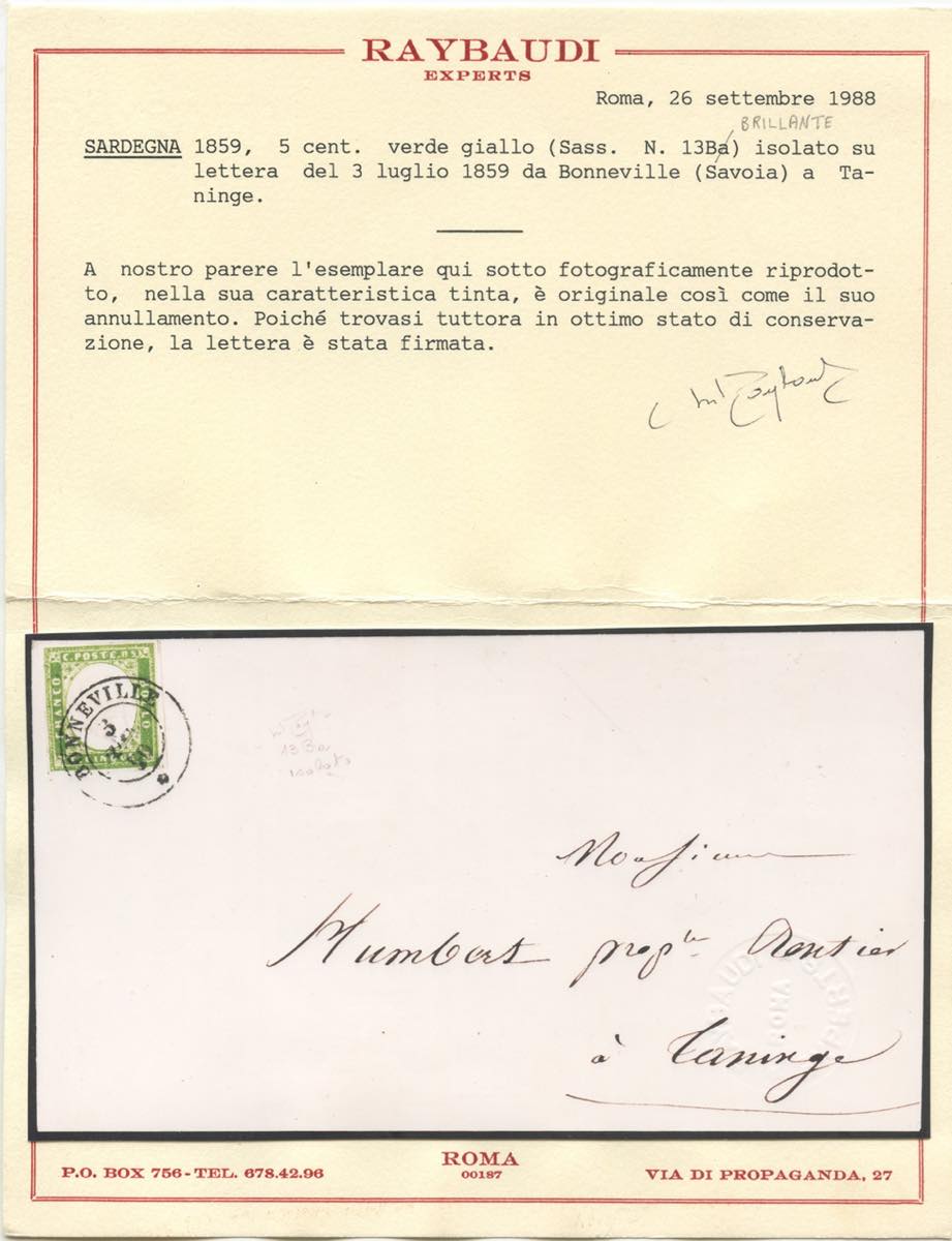 3.7.1859, Lettera da Bonneville per Taninge affrancata con un 5c. Verde Giallo Brillante 13Ba, molto poco comune utilizzato per il distretto postale. (A+) (Cert.Raybaudi)