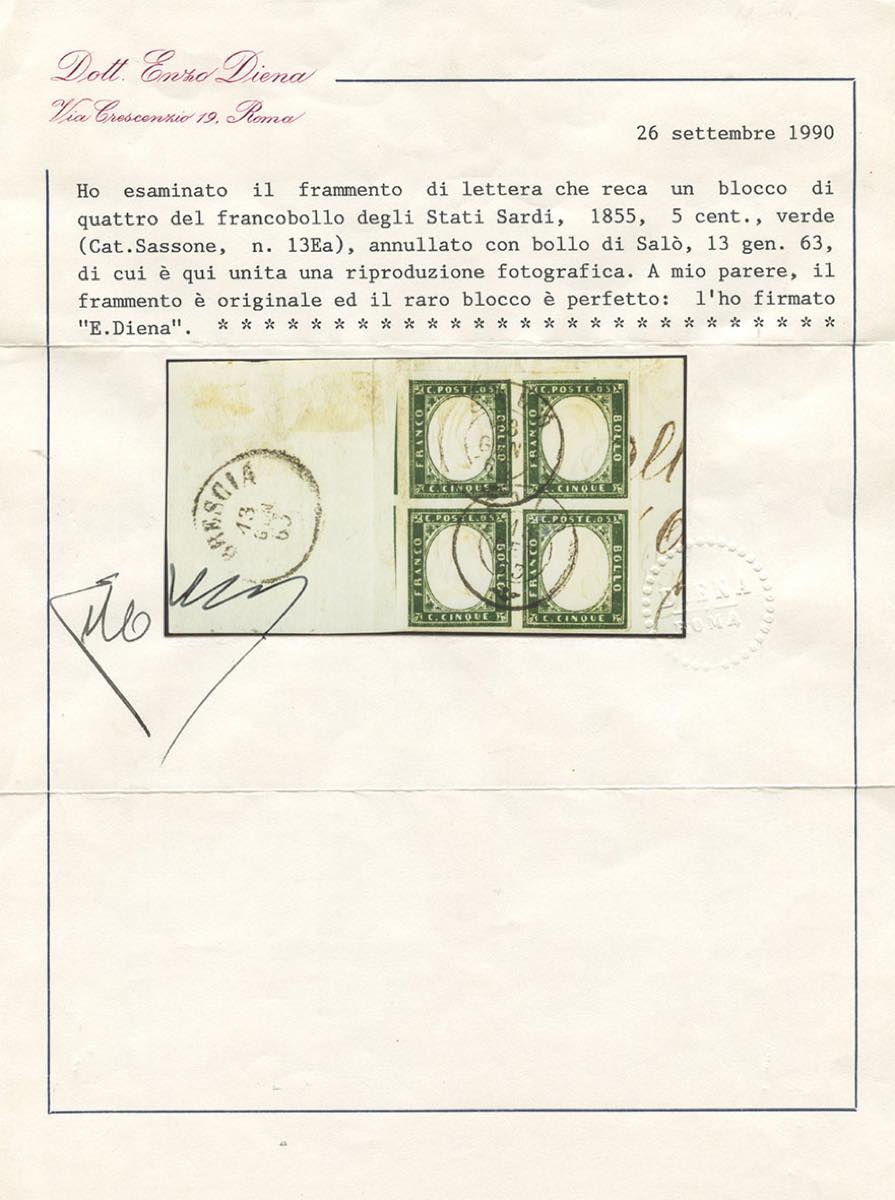 1863, 5c. N.13D Verde Scuro in quartina usata su grande frammento. (A) (E. Diena, Raybaudi, Cert. En. Diena)