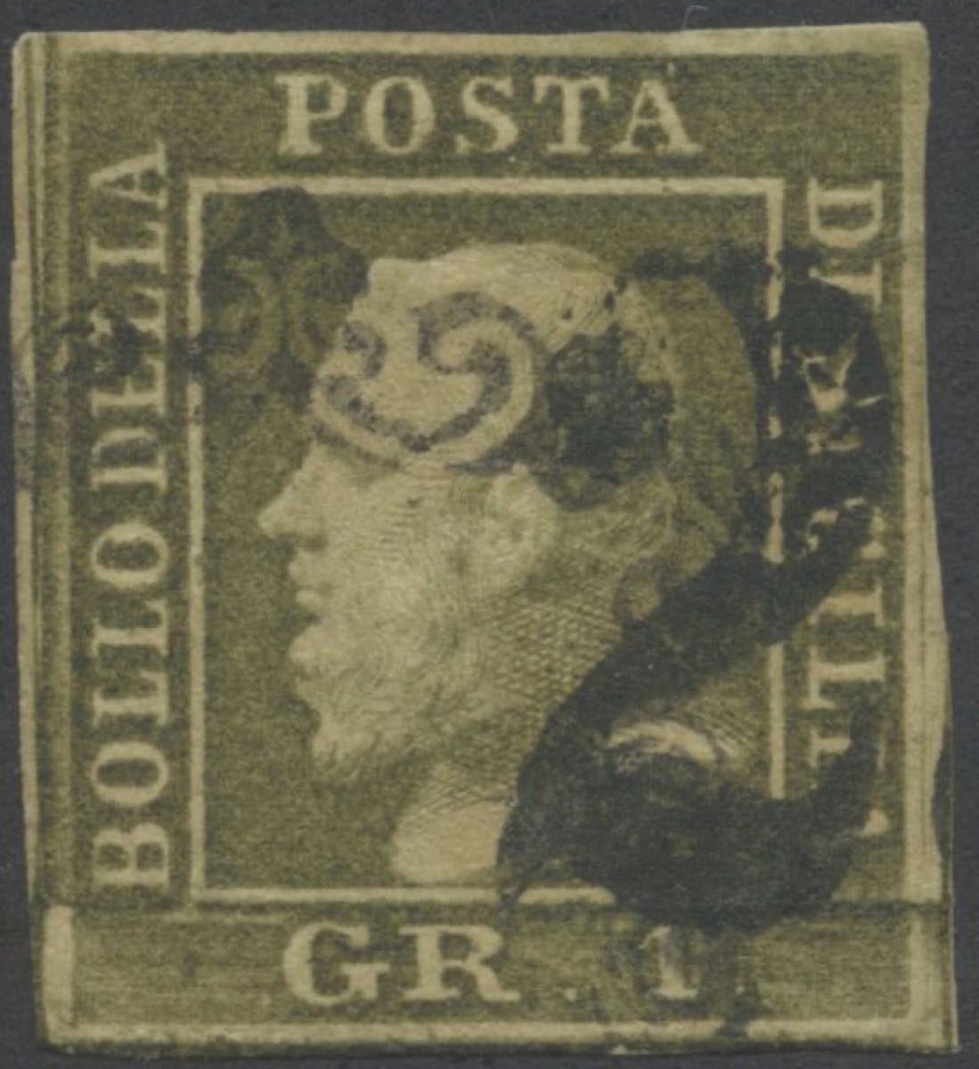 1859, 1gr. III Tav. verde Oliva Carta di Palermo N.5d con interessante obbliterazione a tampone con la cifra '2' e con parte di annullo muto a ferro di cavallo.