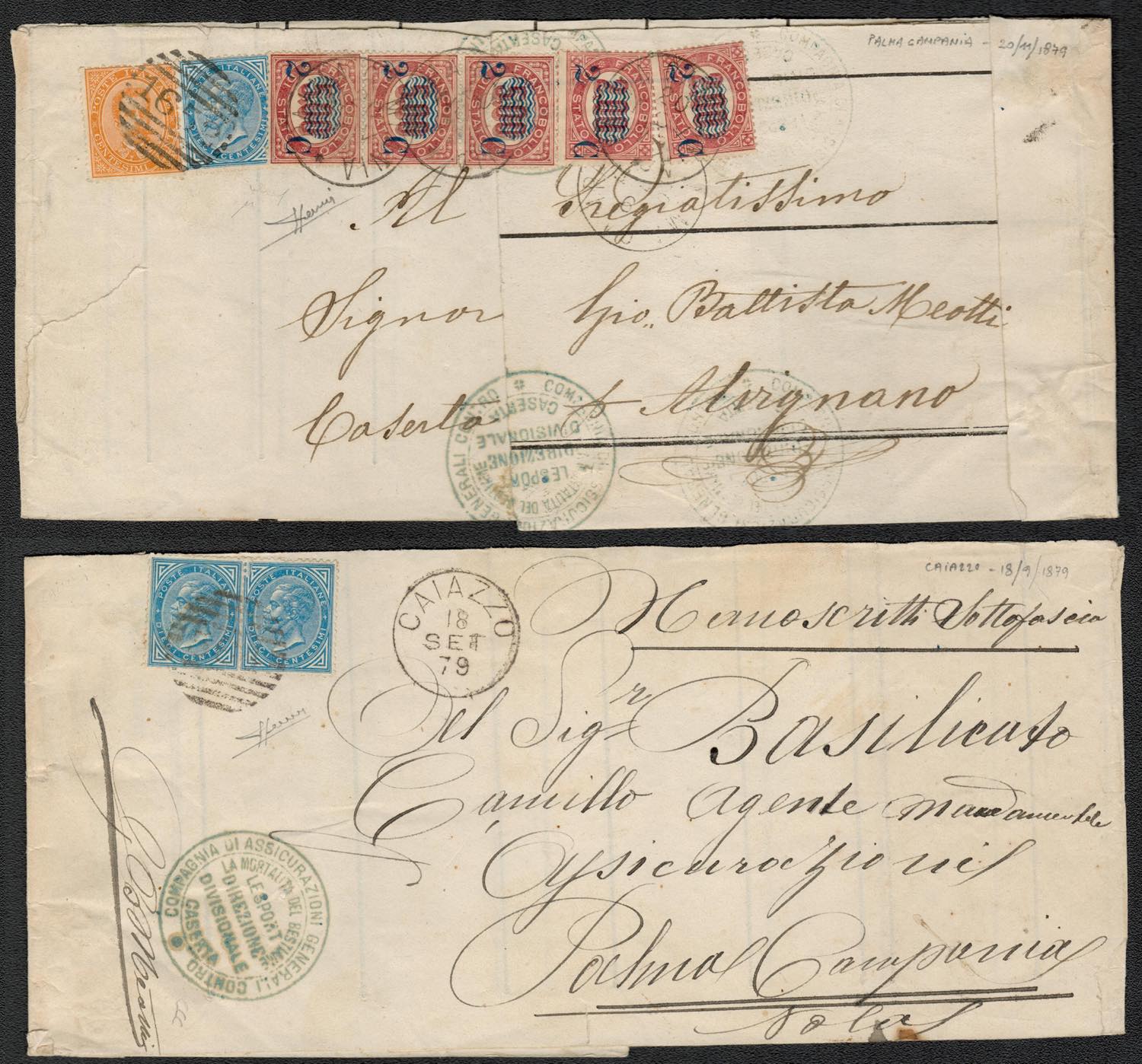 01.08.1877, Fascetta per manoscritti spedita da Palma della Campania per Alvignano con affrancatura coreografica ''Due Re'' di 40c. composta da 10c. Azzurro N.27,2c. Su 2,00 N.34a x 2, 2c. Su 5,00 N.35a x 3, 20c.N.39. Tale fascetta era stata in precedenza spedita da Caiazzo a Palma della Campania in data 18 Settembre 1879 ed affrancata tramite due valori da 10c. N.27. Ottima qualità. Cert. Sorani.