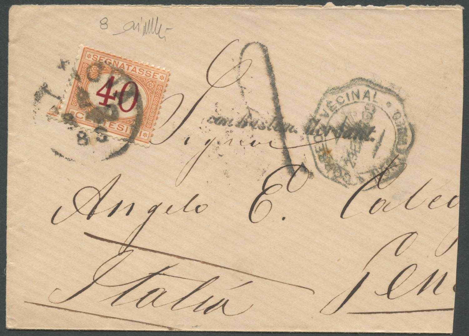 29.02.1880, Lettera da Montevideo inoltrata non affrancata e tassata in arrivo tramite un segnatasse da 40c N.8. Sulla lettera, che risulta essere aperta sulla destra, è impresso il C.I. '' Con i bastimenti Mercant.''