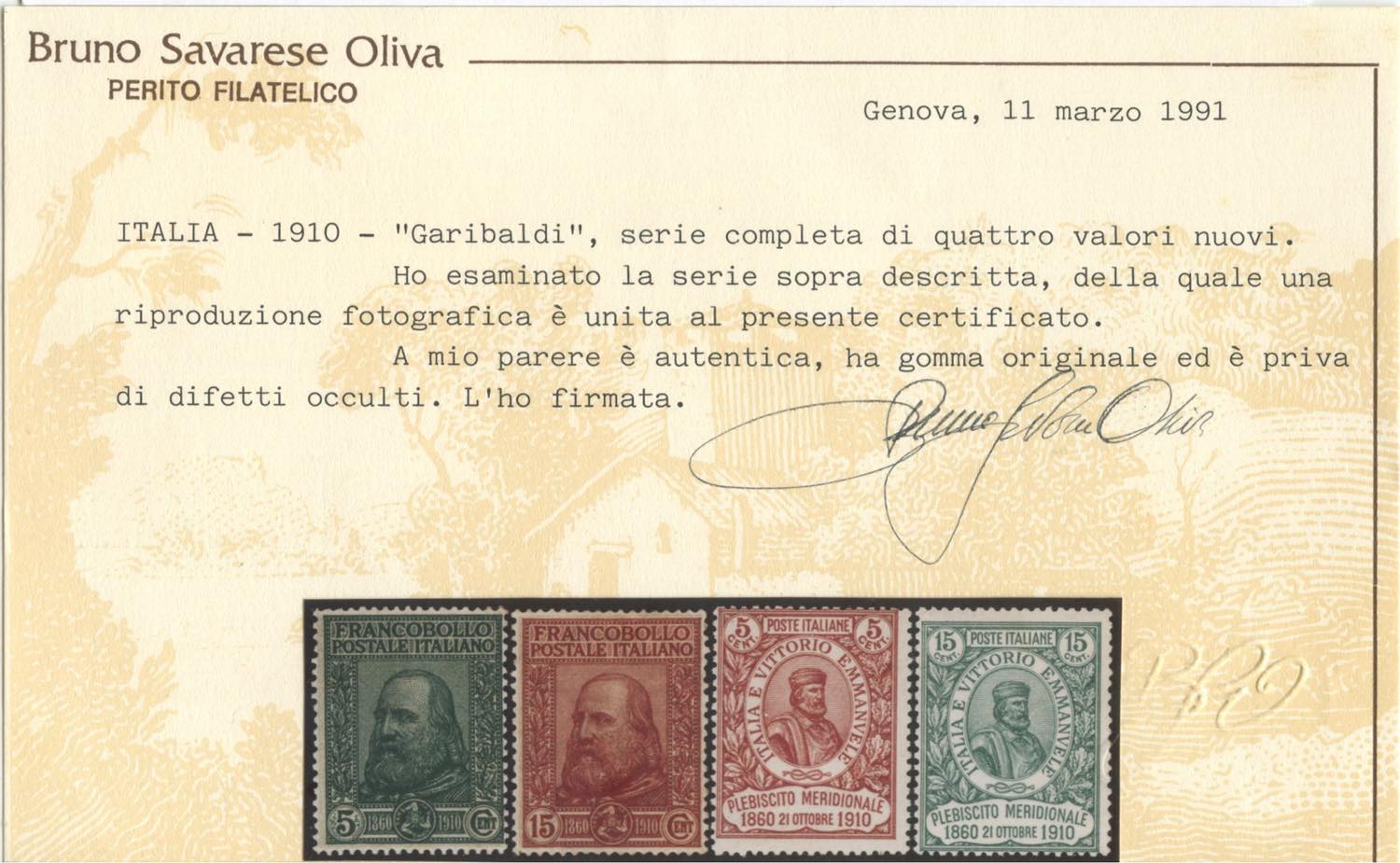 1910, Garibaldi N.87/90 nuova con gomma MLH. Cert. Oliva