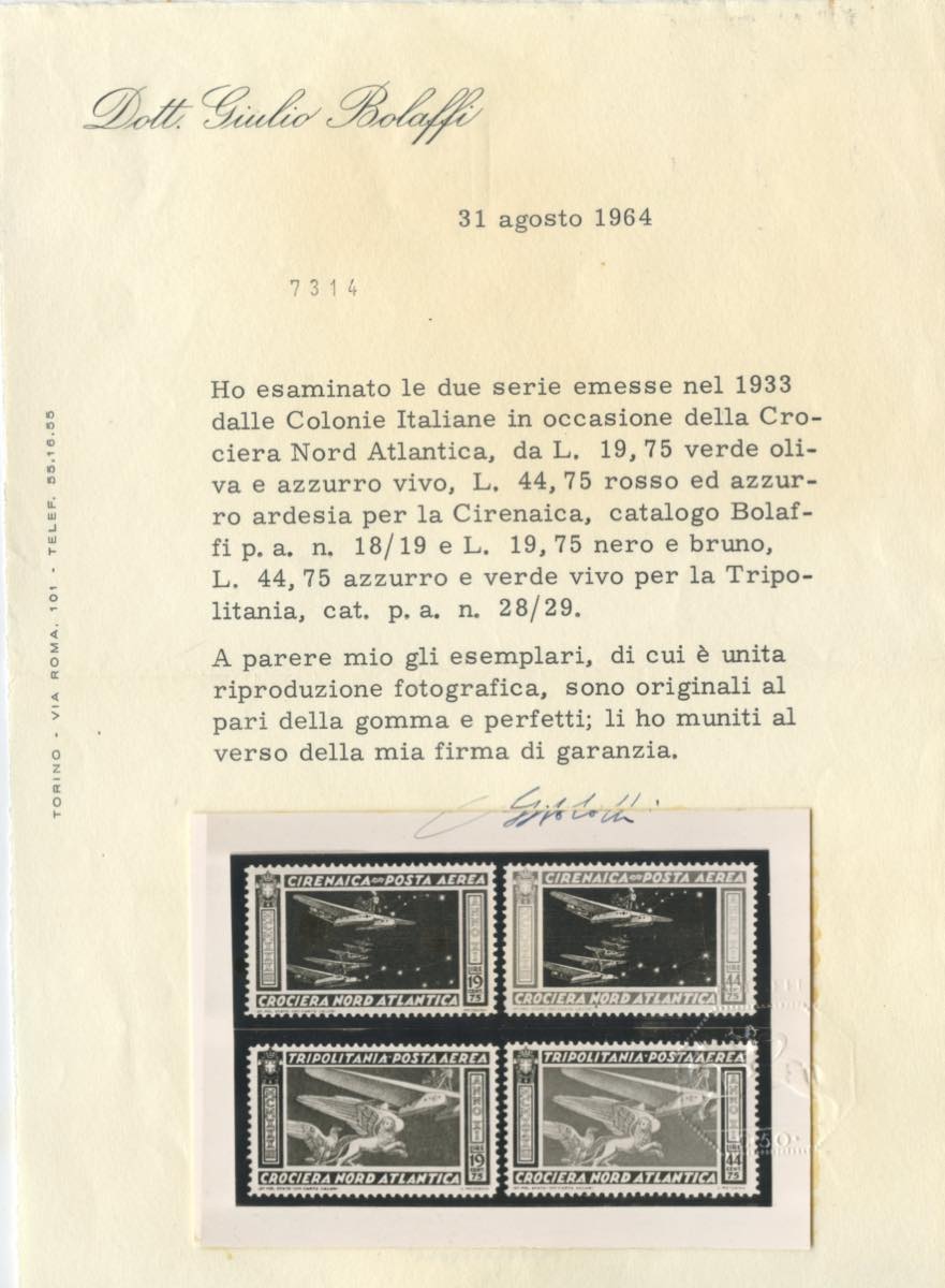 1933, Crociera Nord Atlantica Balbo il Giro, Cirenaica N.19/19 e Tripolitania 28/29 nuovi con gomma integra. Certificato Bolaffi.