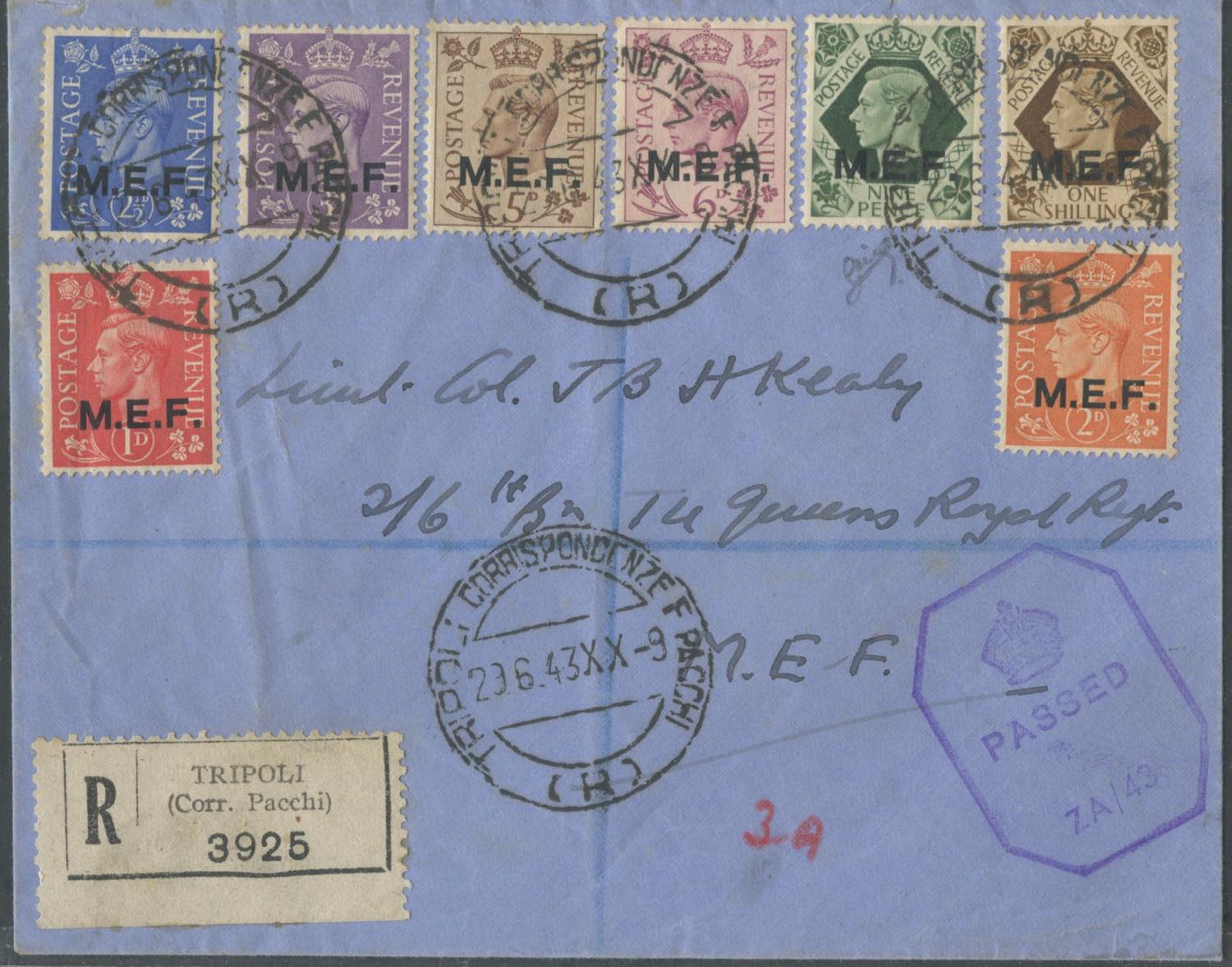 29.06.1943, Lettera non in tariffa con affrancatura composta da 8 valori sovrastampati ''M.E.F.'' N.6/13. Firma Biondi.