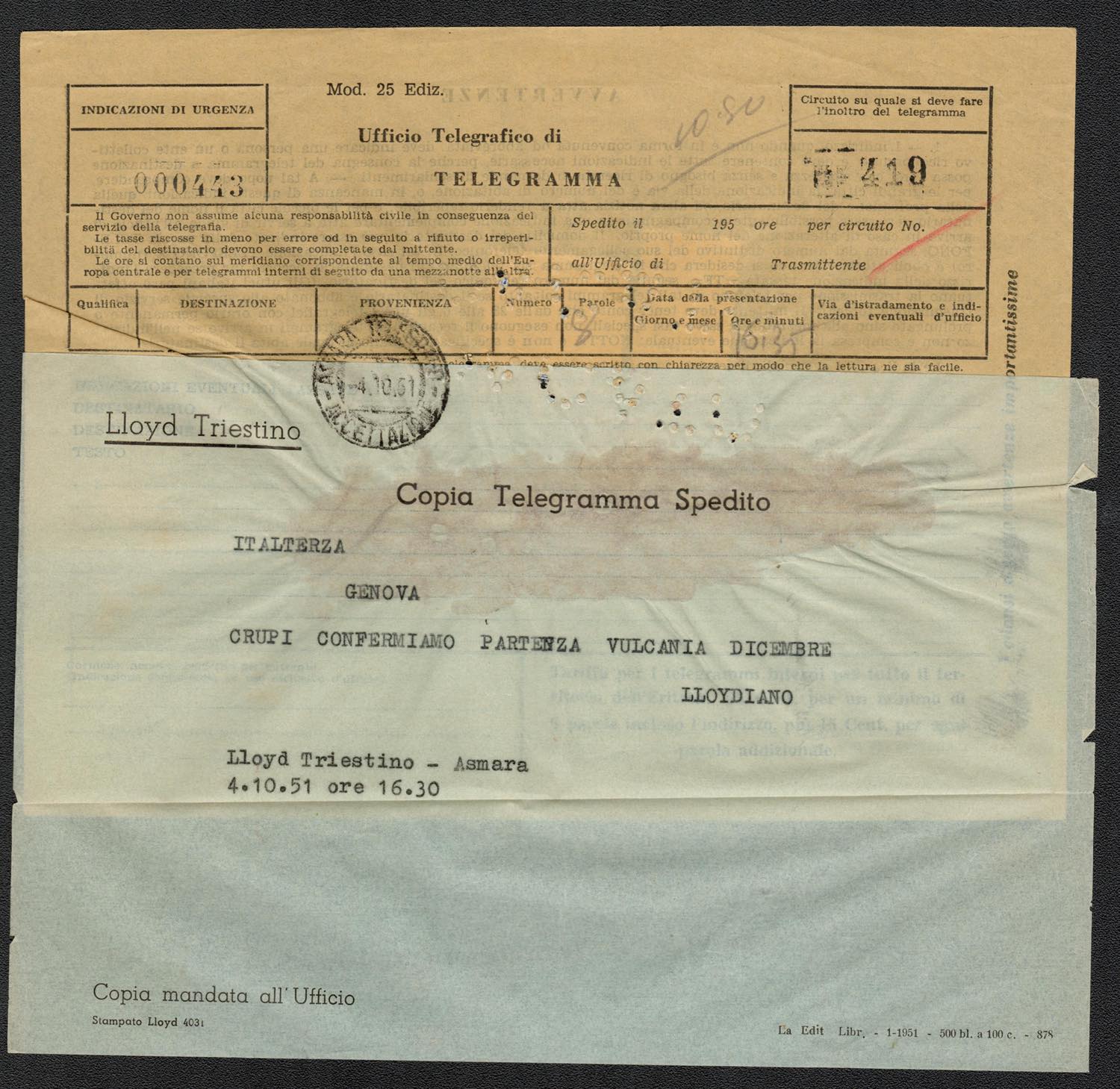 04.10.1951, Modulo telegrafico affrancato tramite tre valori soprastampato...