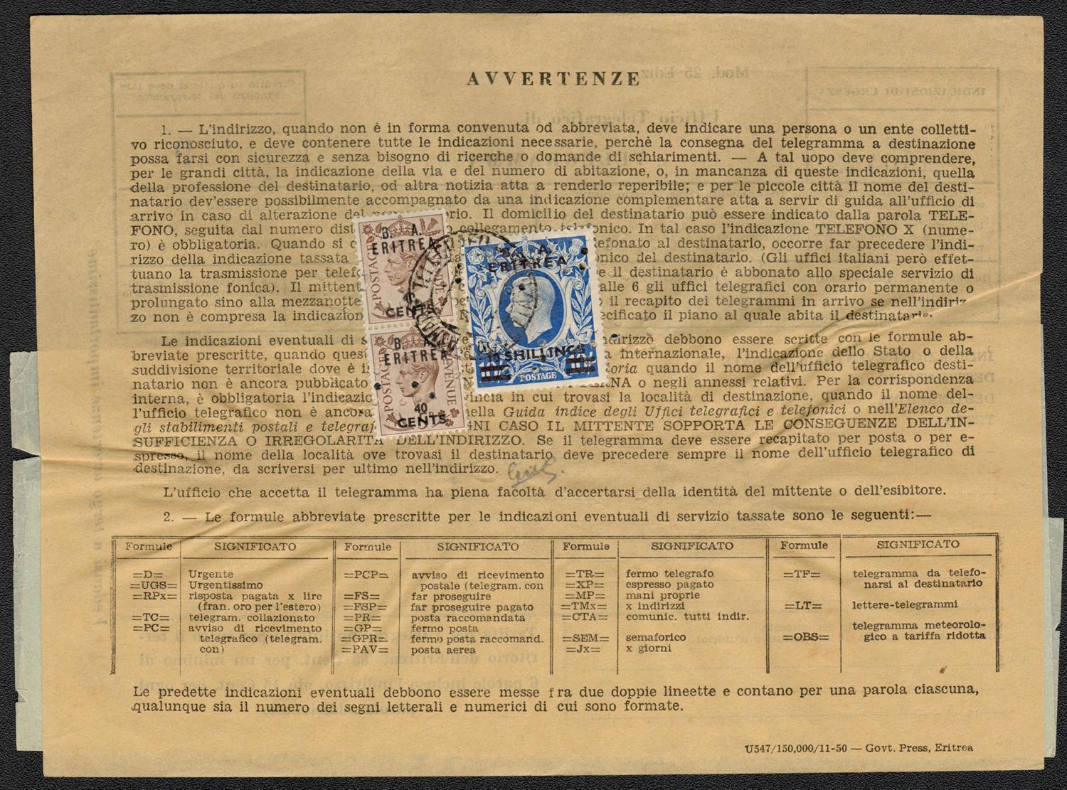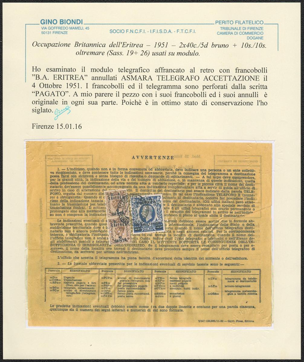04.10.1951, Modulo telegrafico affrancato tramite tre valori soprastampato ''B.A. Eirtrea'' N.19 (due valori) e il N.26. Tali valori risultano annullati tramite l'annullo circolare '' Asmara Telegrafico Accettazione'' e perforati dalla scritta ''PAGATO''. Cert. Biondi.