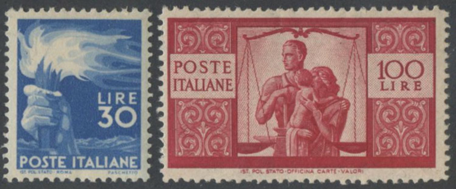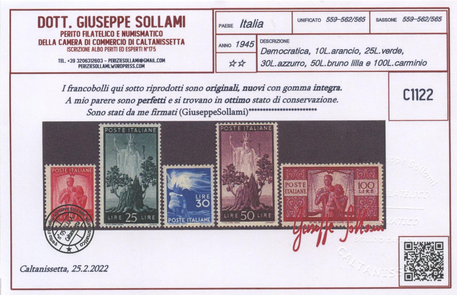 1945, Democratica N.543/565 nuova con gomma MNH. Cert. Sollami.