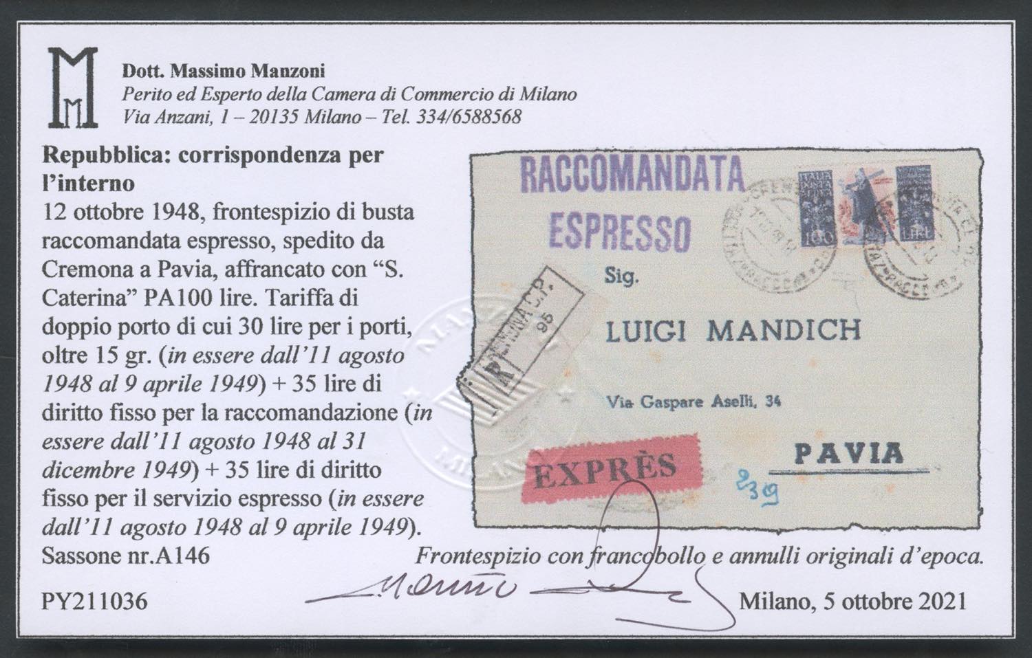 Fronte di lettera raccomandata espressa da Cremona per Pavia affrancata tramite un 100L. S. Caterina N.A146. Certificato Manzoni