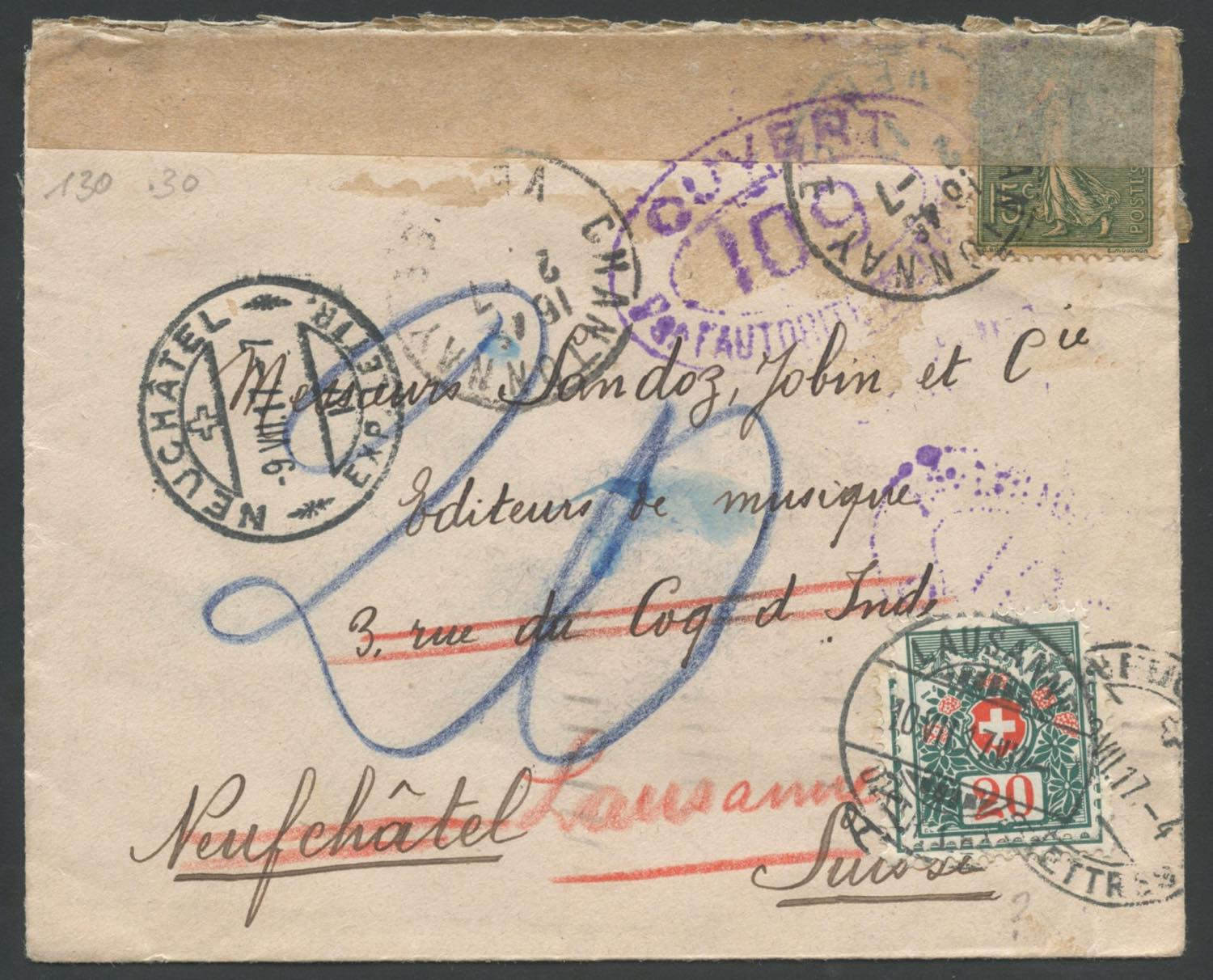 02.07.1916, Lettera spedita da Chantonnay per la Svizzera dove venne rispedita e tassata due volte.