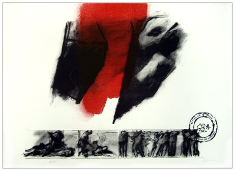 JOSE’ BALMES Montesquiu (Spagna) 1927 El rojo gota a gota va naciendo 1978 Litografia es.48/100. Firma in b. a d. (50 x 70 foglio e lito.) Opera corredata di cartella contenitore originale. Opera facente parte della cartella “Per il Cile” a cura di Elio Gabbuggiani, Edizioni della Bezuga, Firenze, composta di 10 opere di 10 artisti donate in favore del Cile.