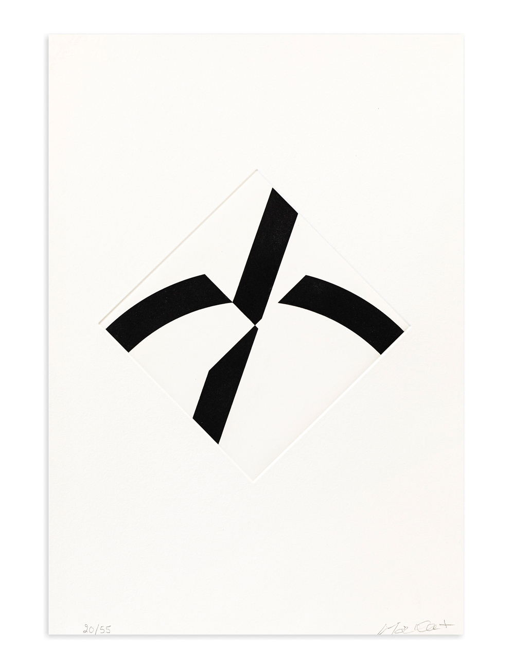 L'edizione è impreziosita da un'incisione all'acquatinta di François Morellet recante firma e numerazione (Esemplare 20/55) a matita al fronte (incisione stampata da Roberto Giudici in Varese su carta Zerkall da 600g)