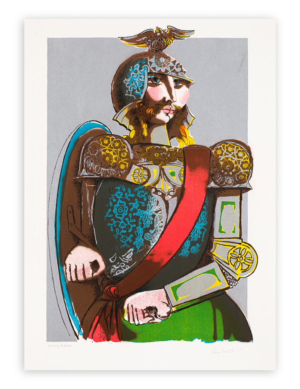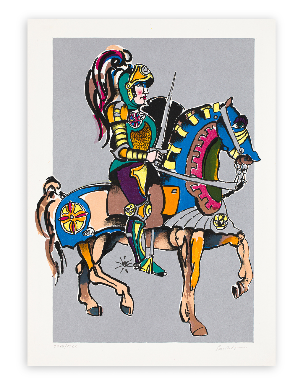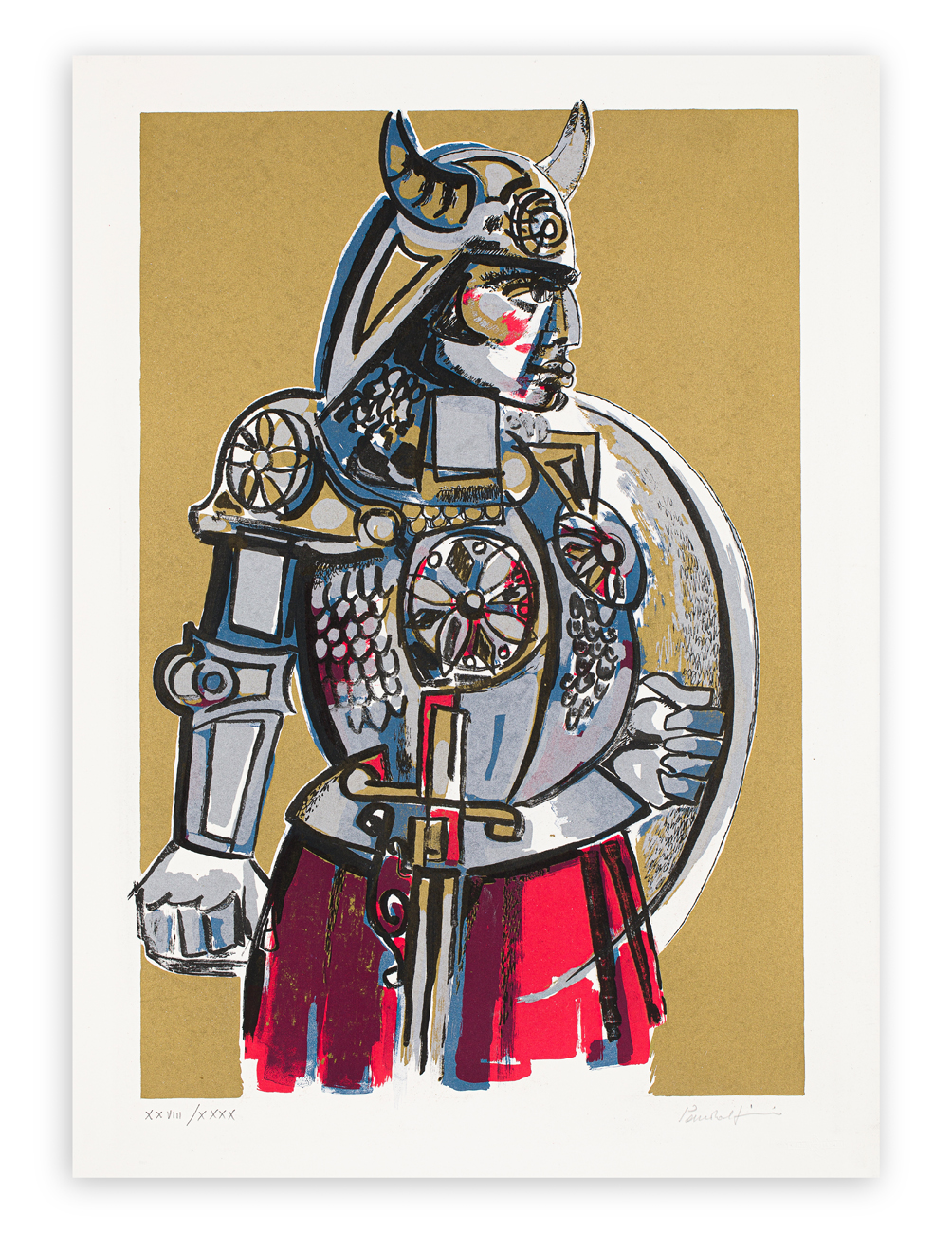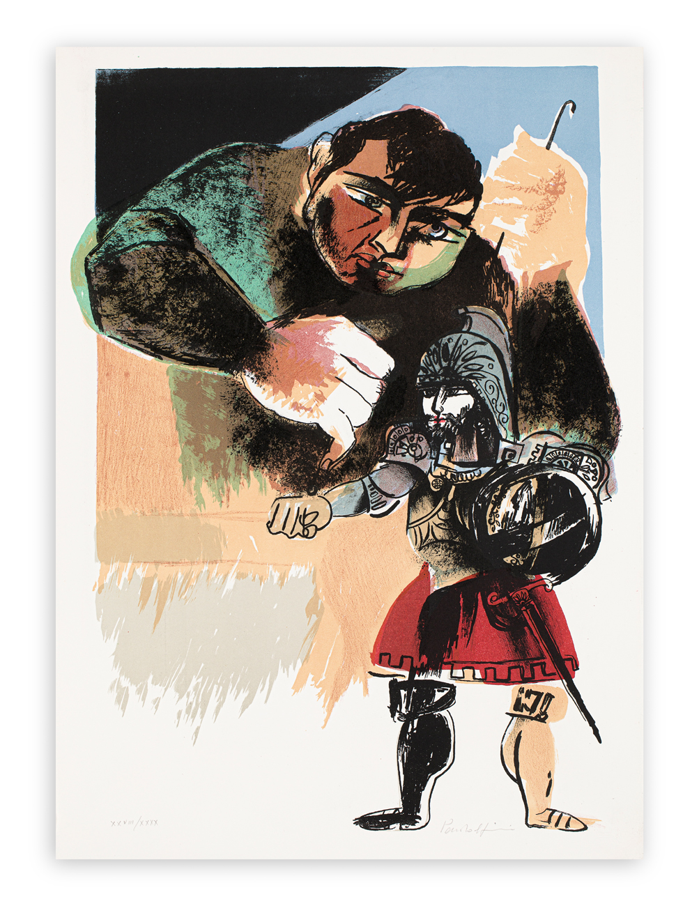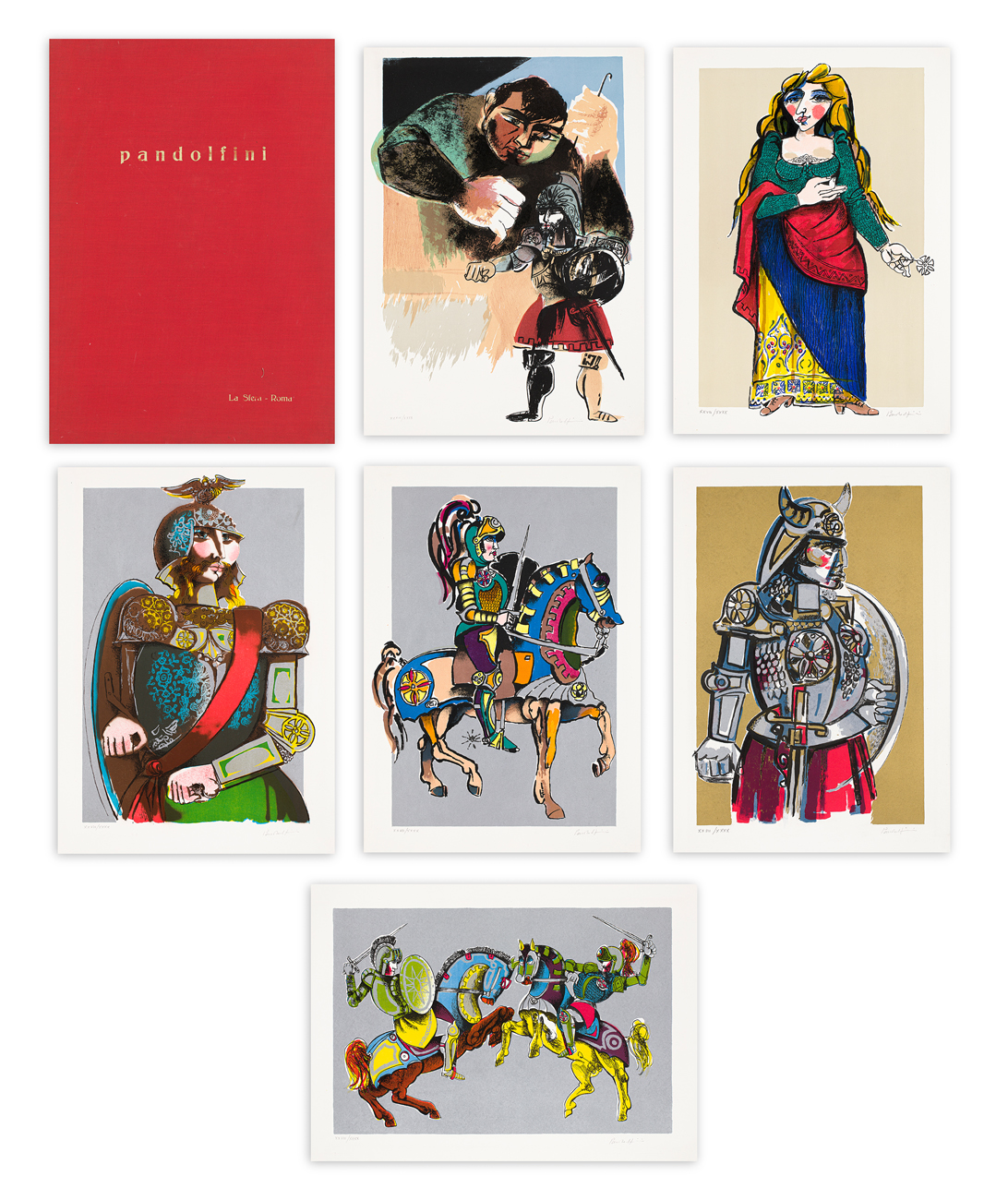 Cartella contenente testo di presentazione di Emilio Villa e 6 litografie, ciascuna recante firma e numerazione (Esemplari XXVIII/XXXX) a matita al fronte e timbro a secco dello Stampatore